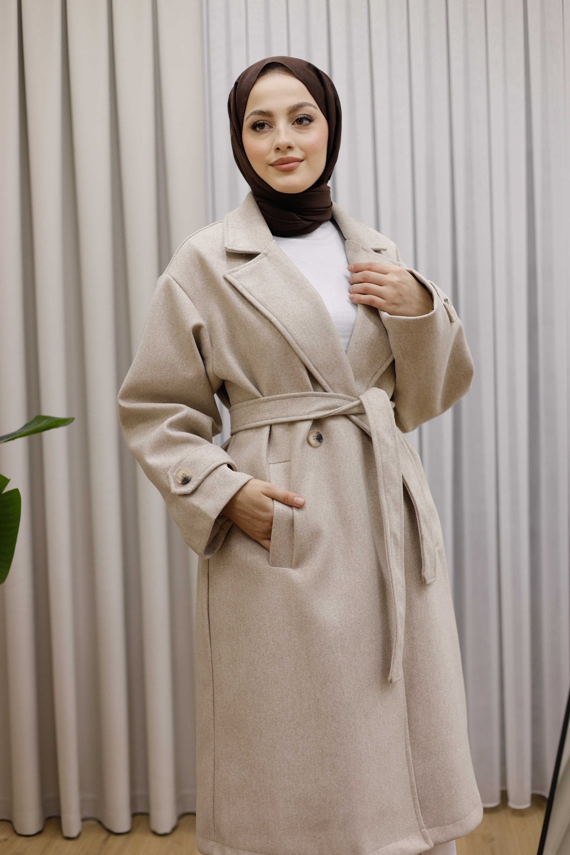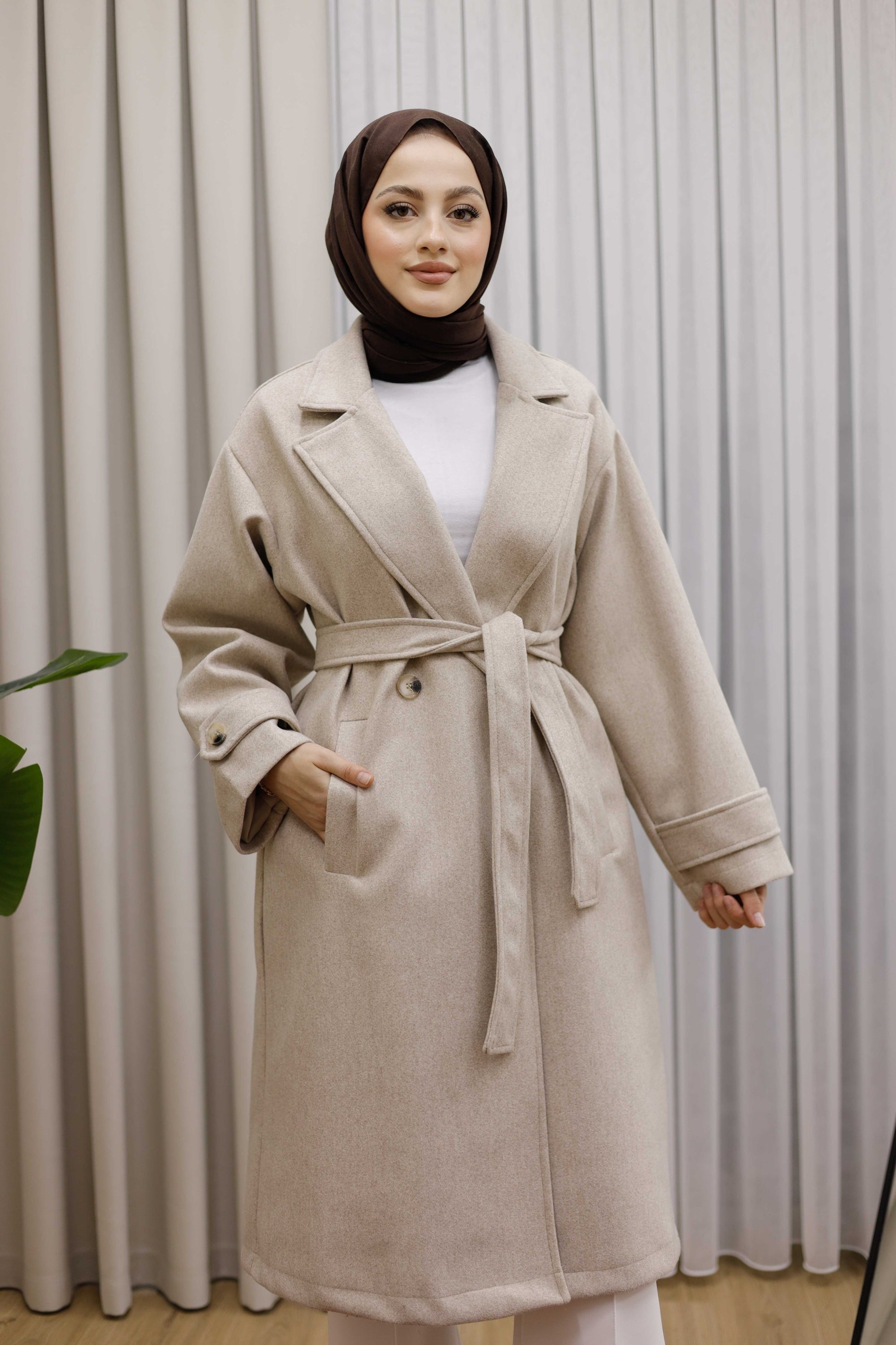 Ceket Yaka Kruvaze Kuşaklı Premium Ara Boy Kaban - Taş