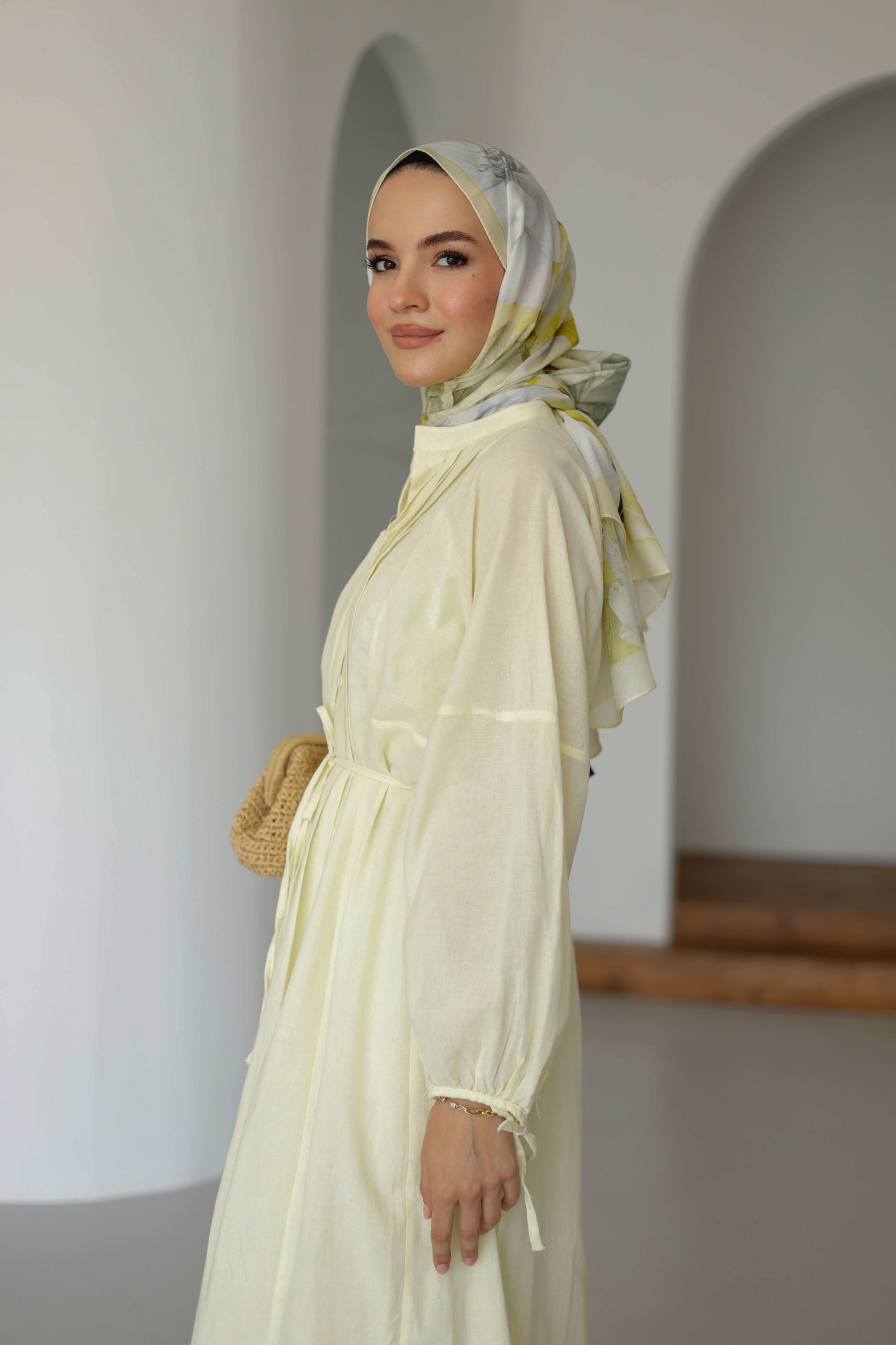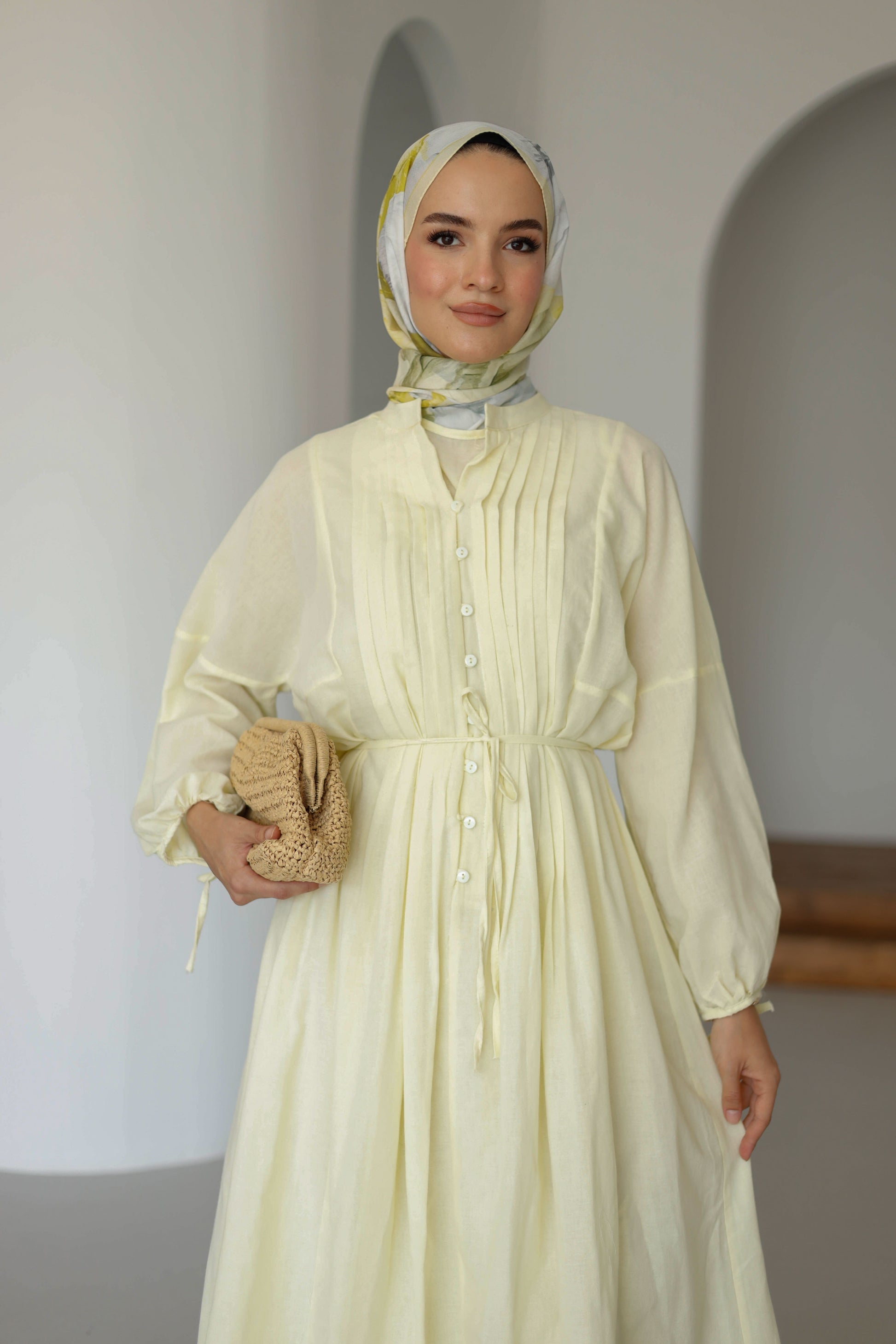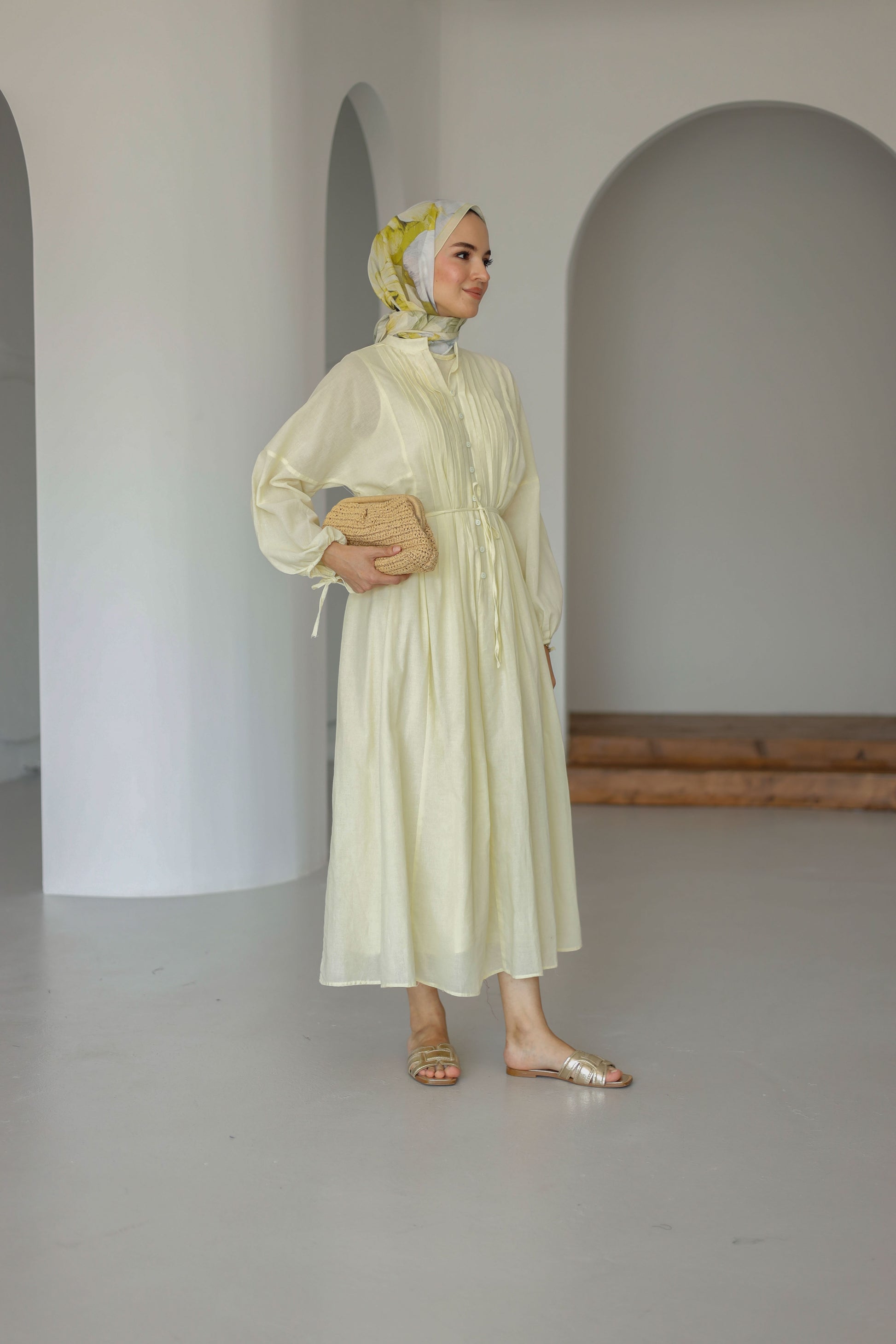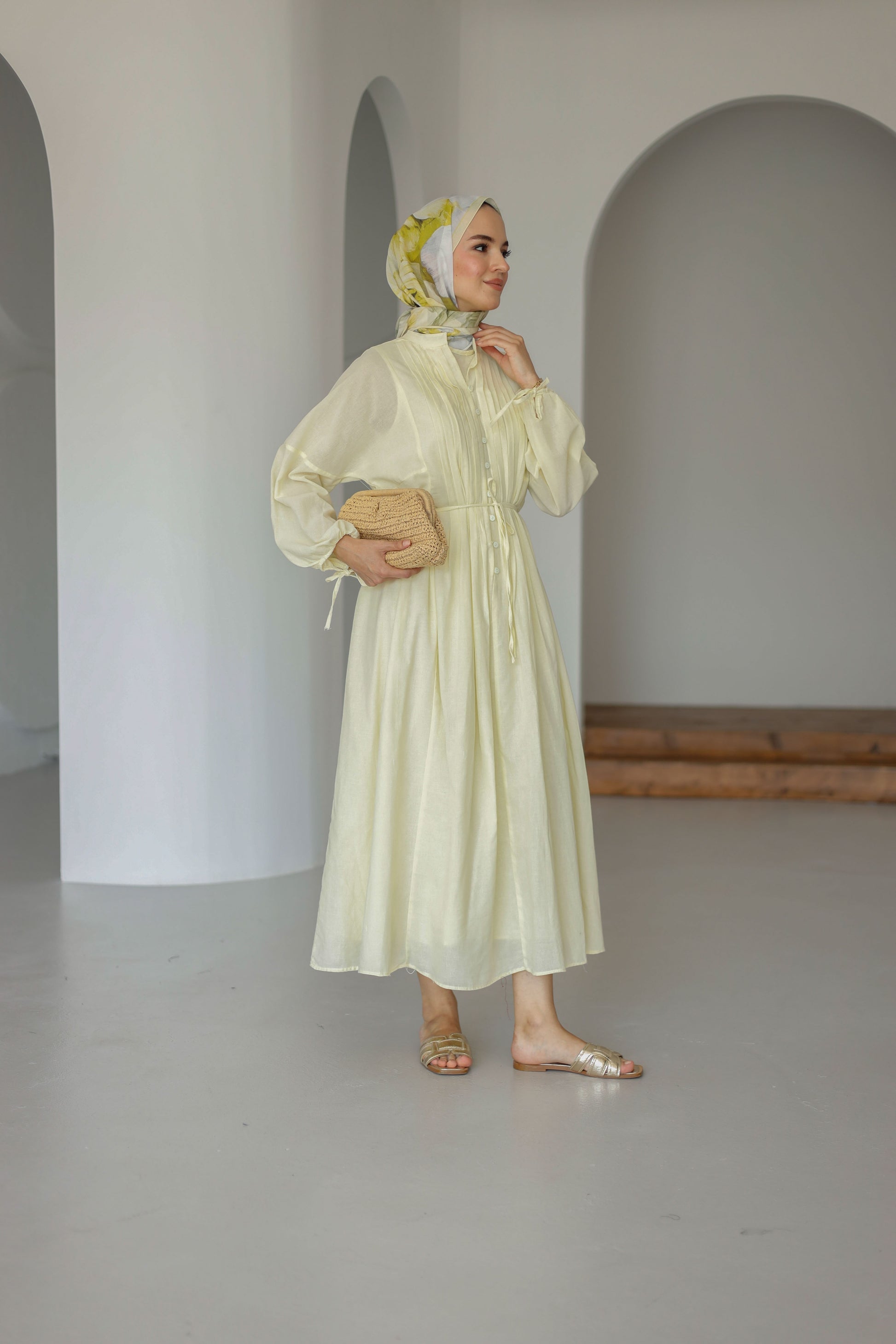 Nervürlü Pamuk Keten Elbise Astarlı - Sarı