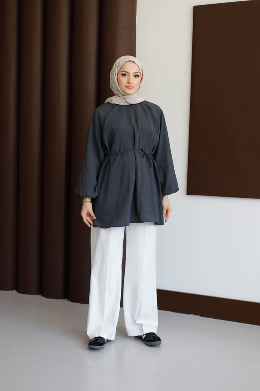 Balon Kol Bel Bağlamalı Tesettür Gömlek - Antrasit