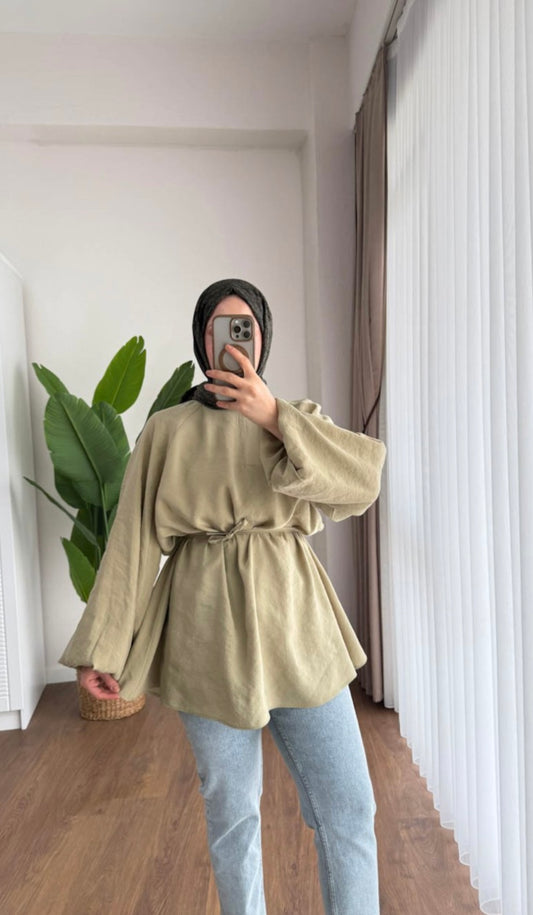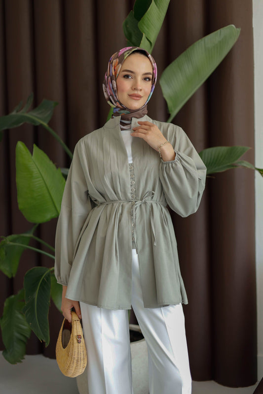 Balon Kol Bel Bağlamalı Tesettür Gömlek - Haki