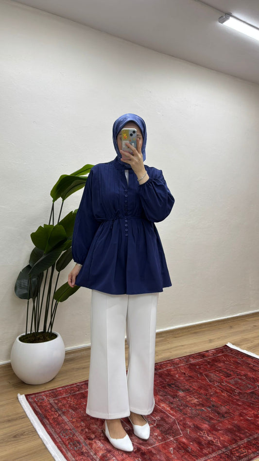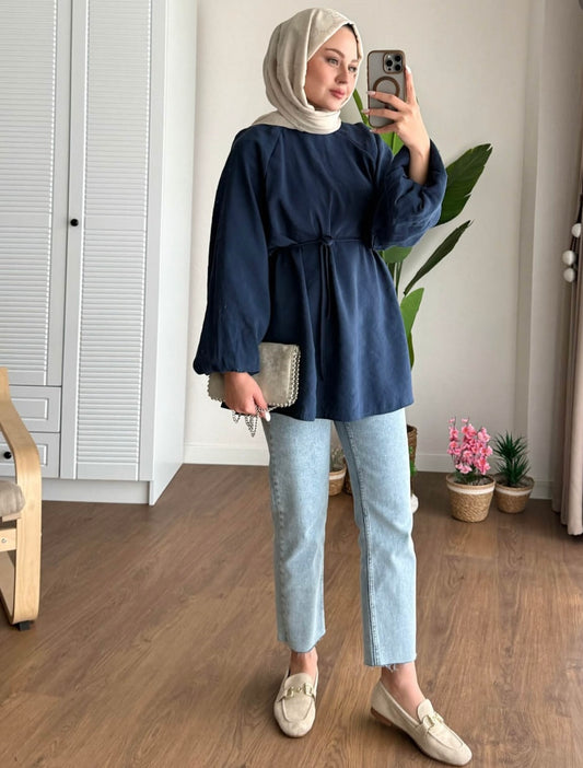 Balon Kol Bel Bağlamalı Tesettür Gömlek - Lacivert
