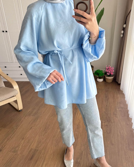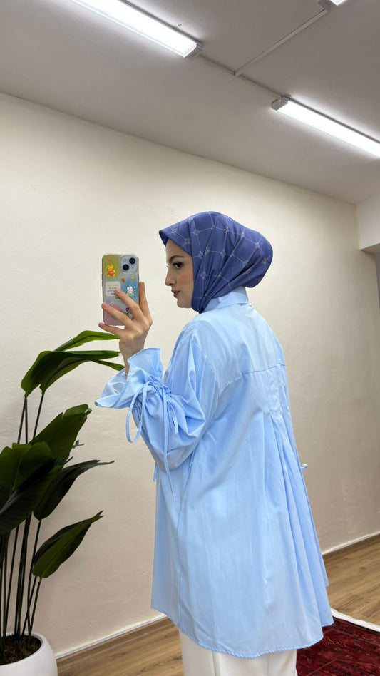 Balon Kol Bel Bağlamalı Tesettür Gömlek - Mavi