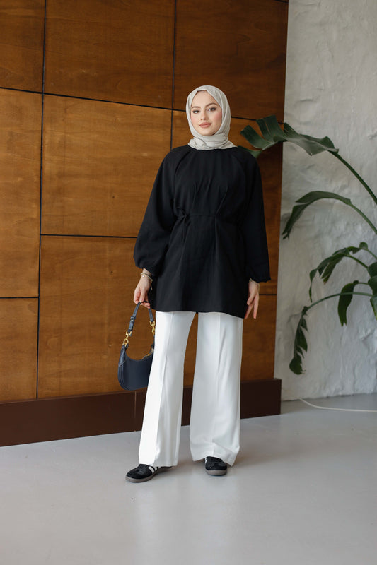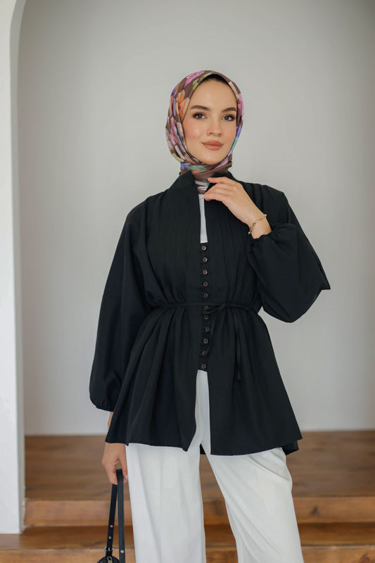 Balon Kol Bel Bağlamalı Tesettür Gömlek - Siyah