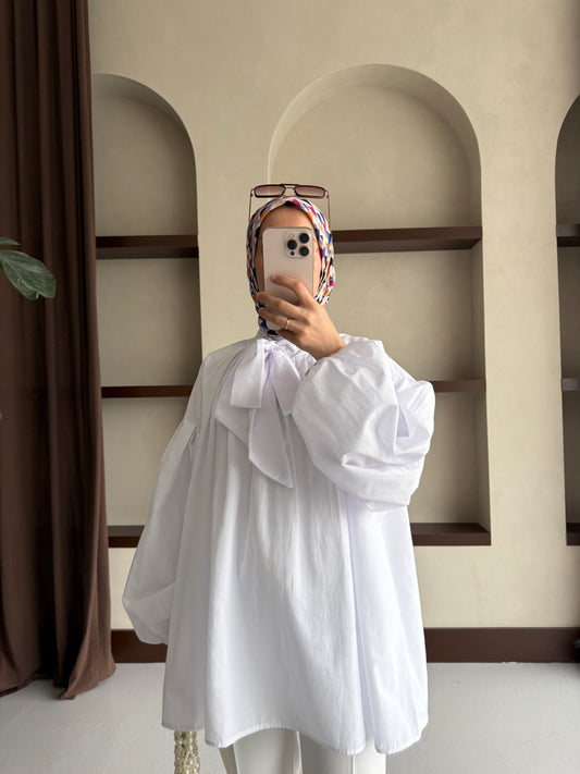 Yakası Bağlamalı Balon Kol Tesettür Gömlek - Beyaz
