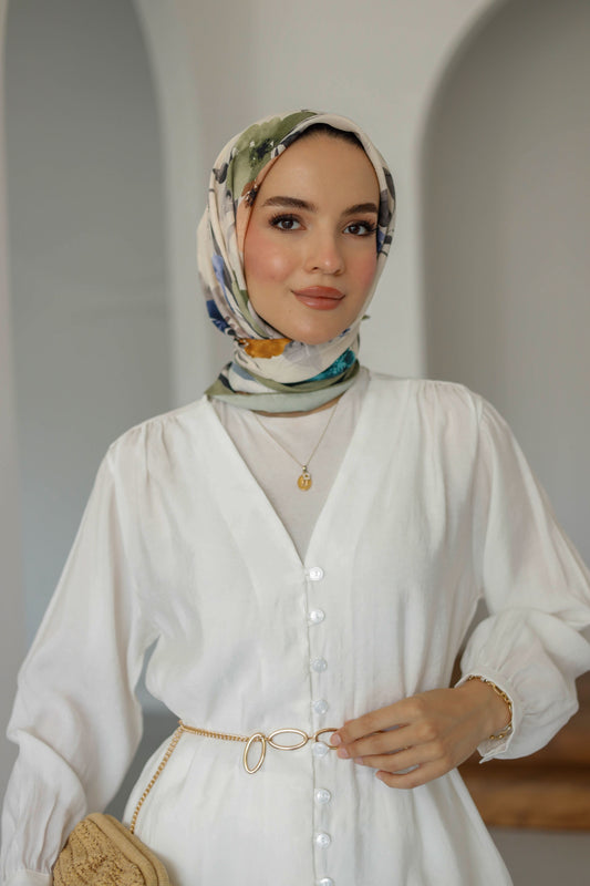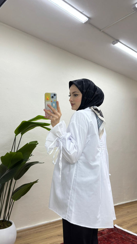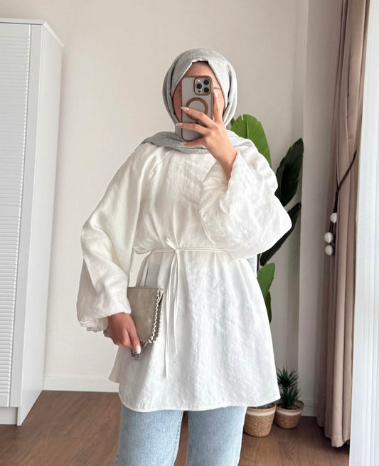 Balon Kol Bel Bağlamalı Tesettür Gömlek - Beyaz
