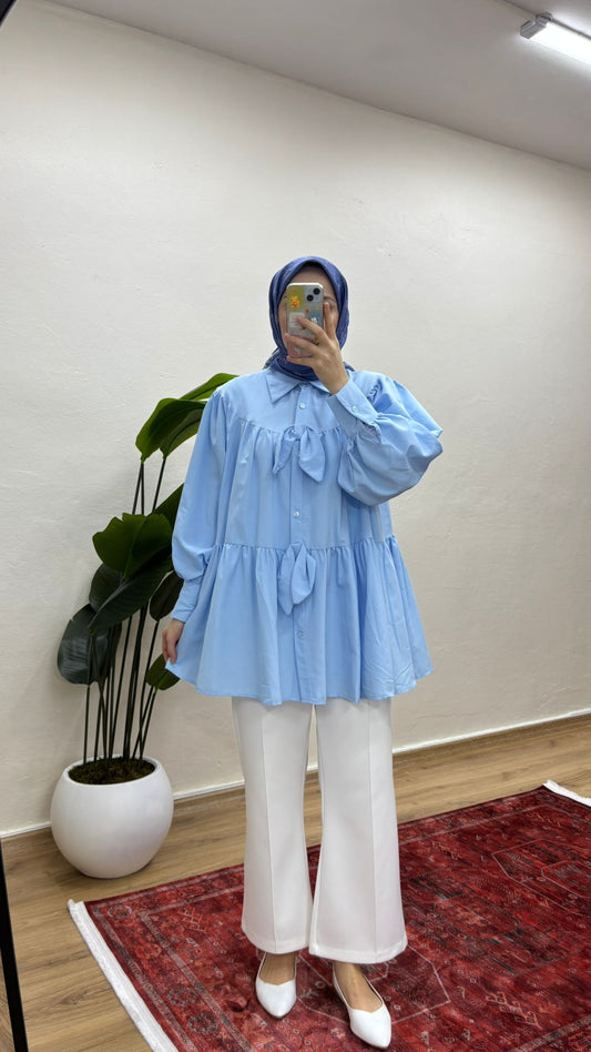 Fiyonklu Salaş Tesettür Gömlek - Mavi