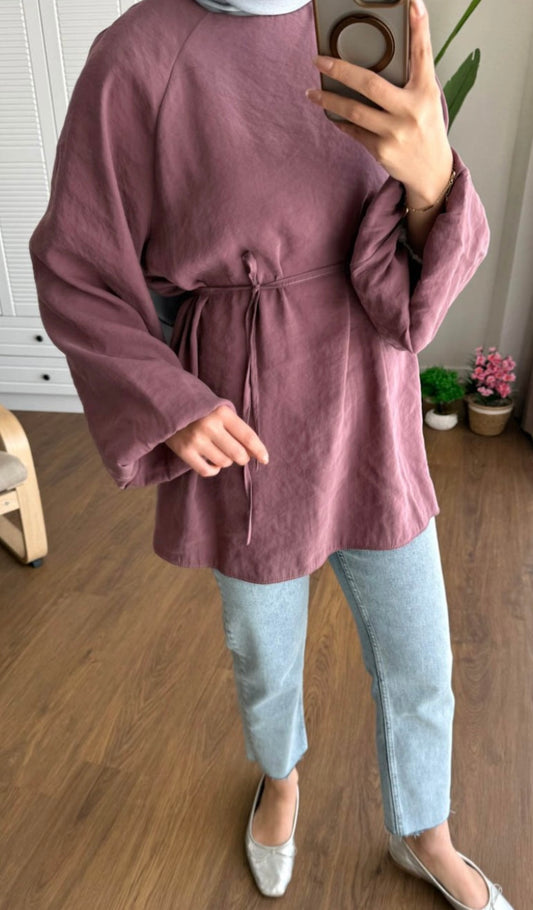 Balon Kol Bel Bağlamalı Tesettür Gömlek - Gül