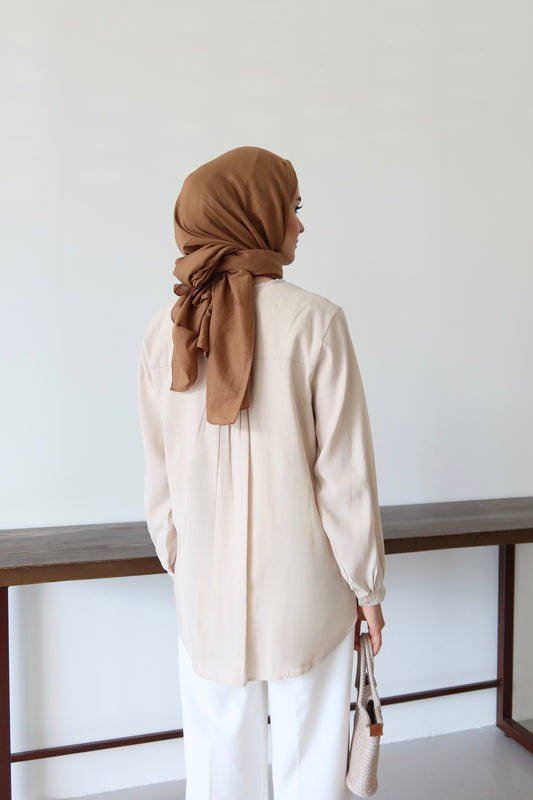 V Yaka Önü Düğme Detaylı Tesettür Gömlek - Bej