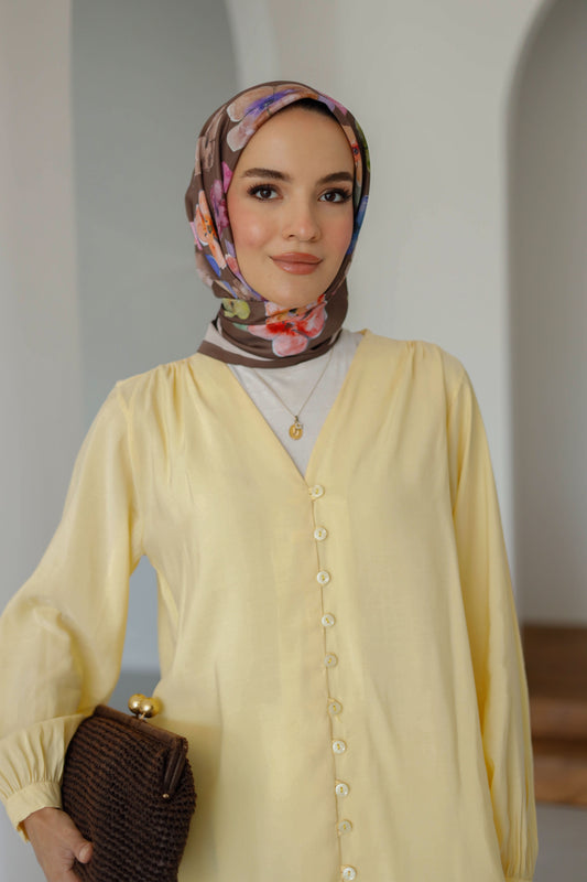 V Yaka Önü Düğme Detaylı Tesettür Gömlek - Sarı
