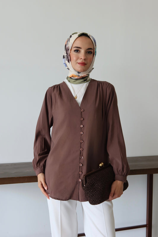 V Yaka Önü Düğme Detaylı Tesettür Gömlek - Kahverengi