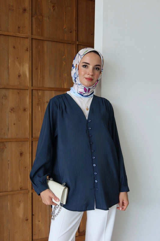 V Yaka Önü Düğme Detaylı Tesettür Gömlek - Lacivert