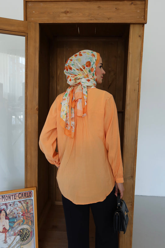 V Yaka Önü Düğme Detaylı Tesettür Gömlek - Turuncu