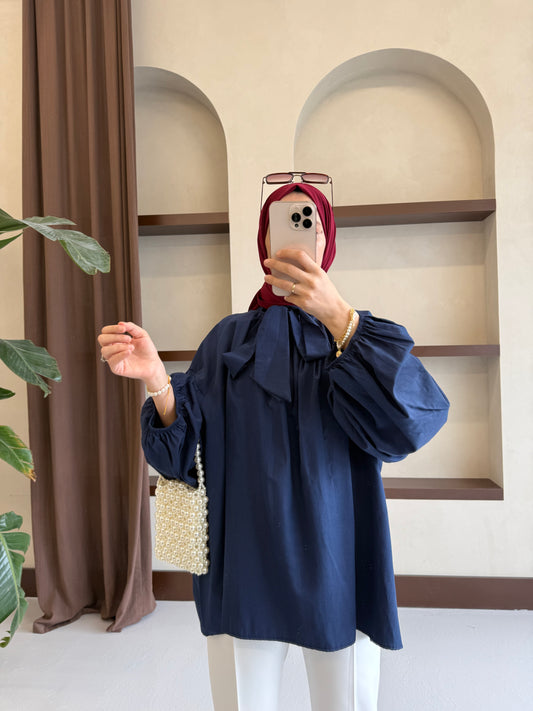 Yakası Bağlamalı Balon Kol Tesettür Gömlek - Lacivert
