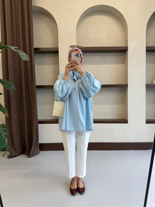 Yakası Bağlamalı Balon Kol Tesettür Gömlek - Mavi