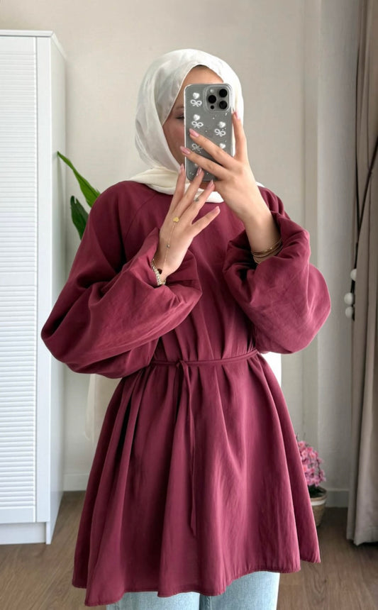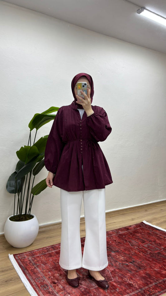 Balon Kol Bel Bağlamalı Tesettür Gömlek - Bordo