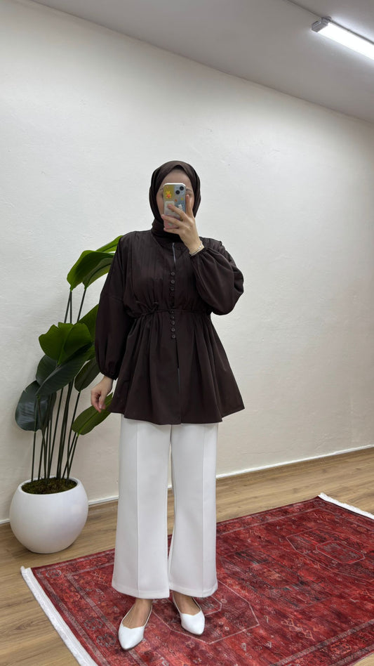 Balon Kol Bel Bağlamalı Tesettür Gömlek - Kahverengi