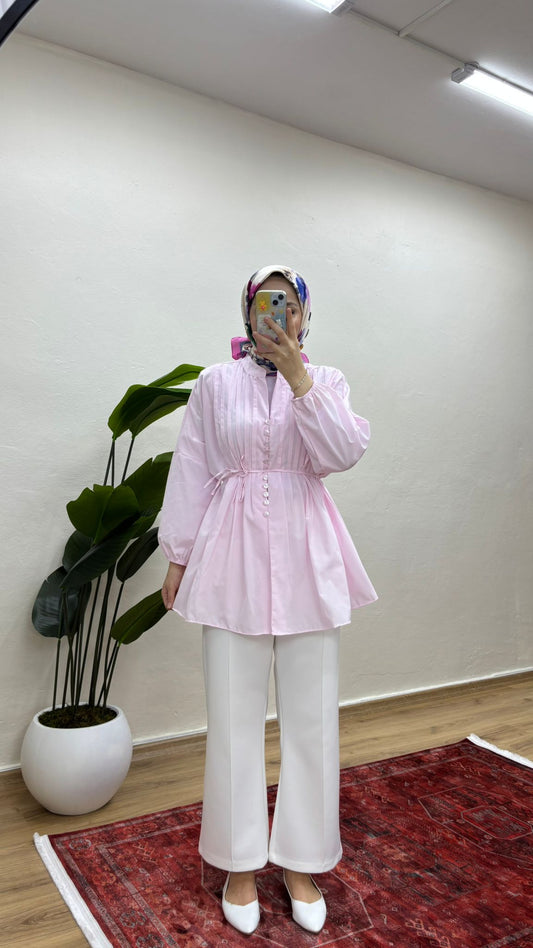Balon Kol Bel Bağlamalı Tesettür Gömlek - Pembe