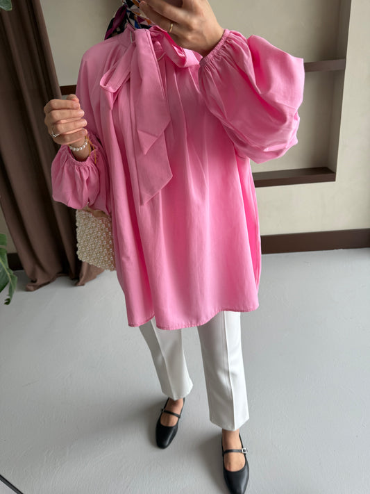 Yakası Bağlamalı Balon Kol Tesettür Gömlek - Pembe