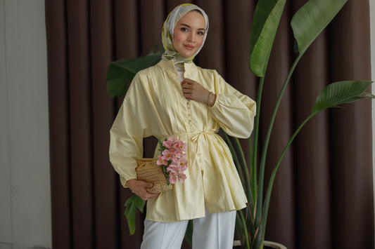 Balon Kol Bel Bağlamalı Tesettür Gömlek - Sarı