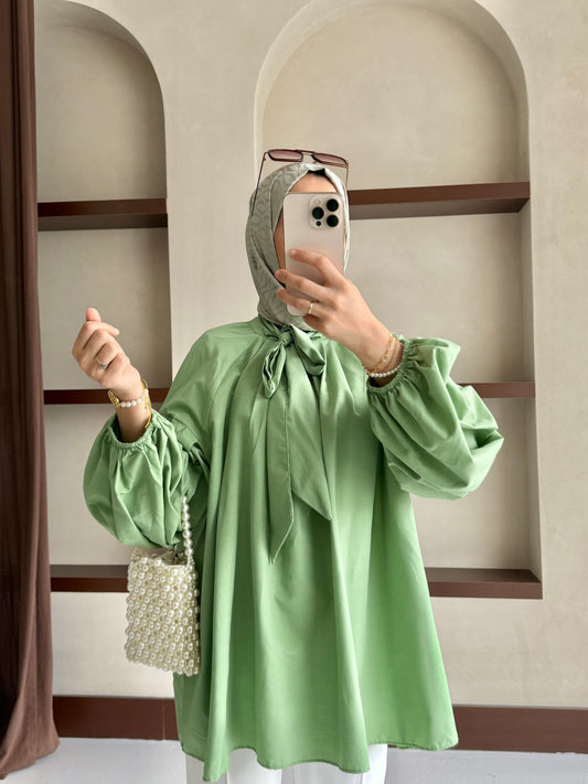Yakası Bağlamalı Balon Kol Tesettür Gömlek - Yeşil
