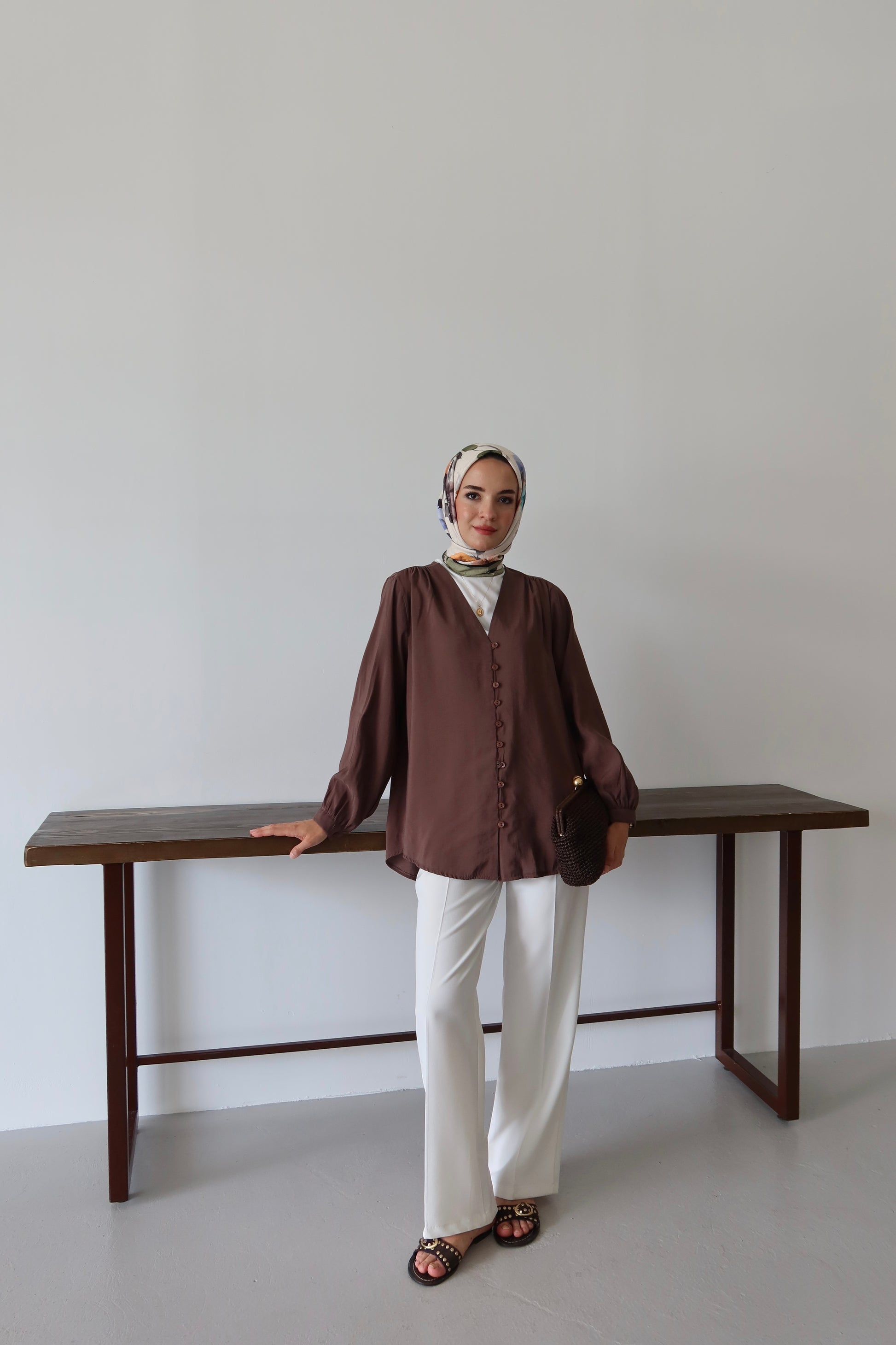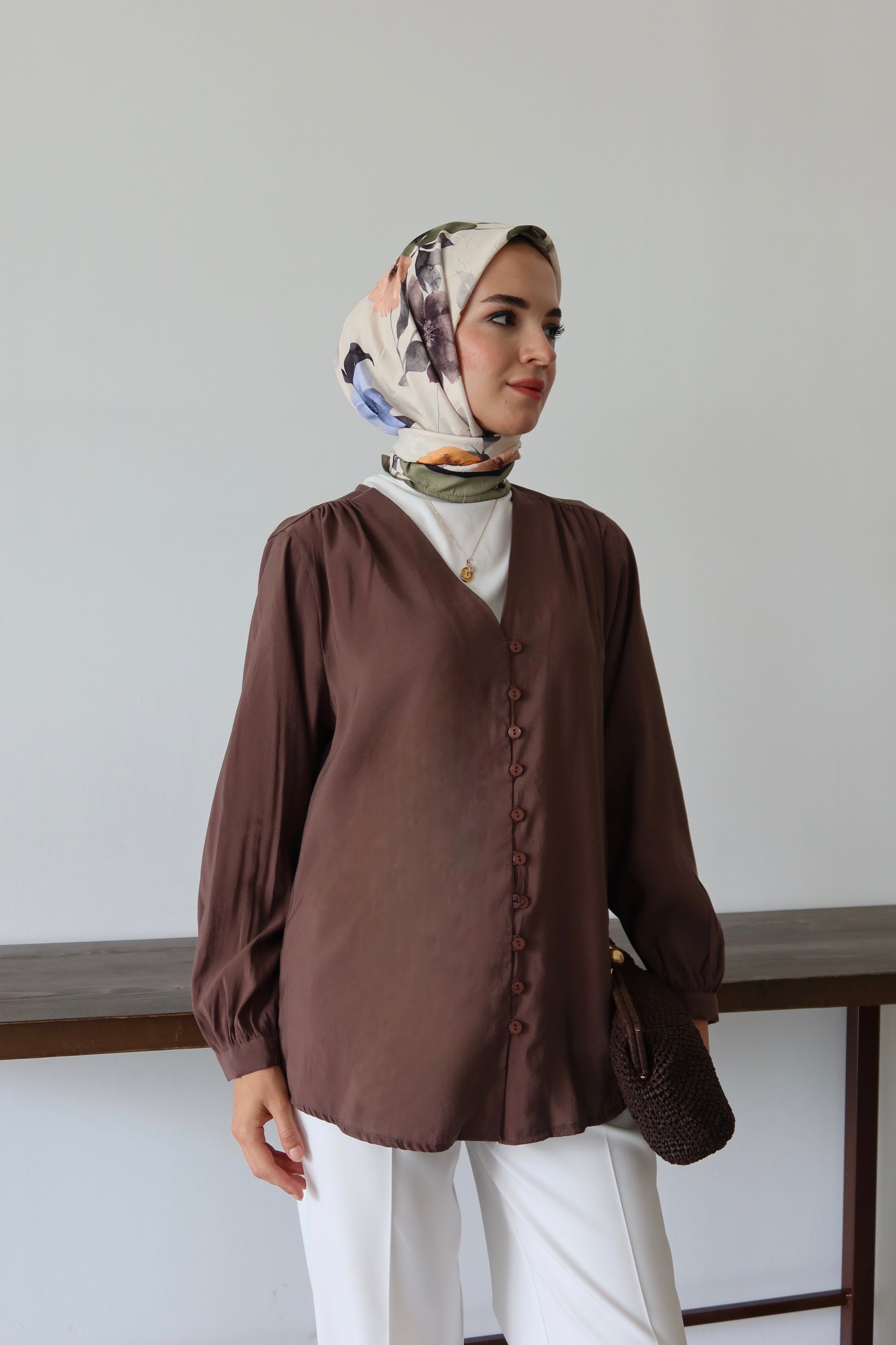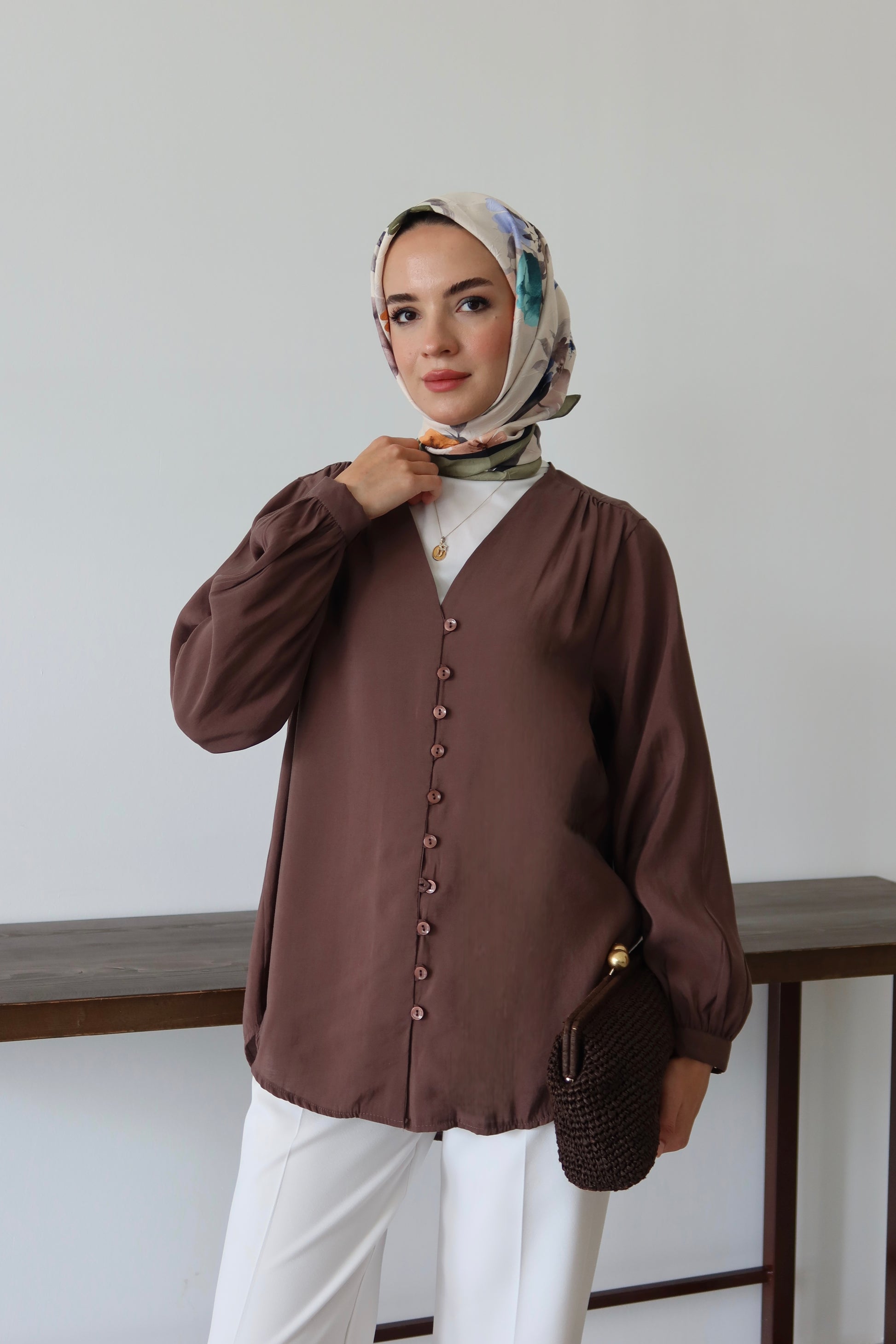 V Yaka Önü Düğme Detaylı Tesettür Gömlek - Kahverengi