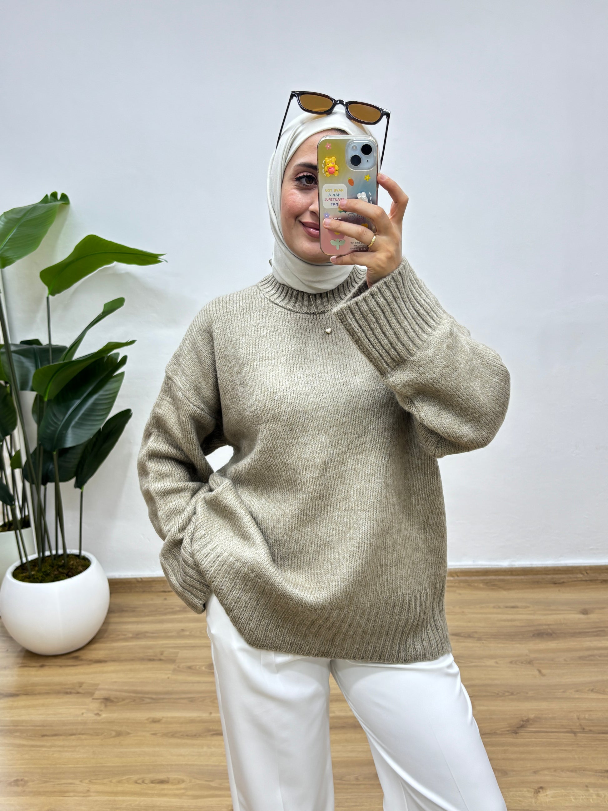 Oversize Bisiklet Yaka Kazak - K.Bej