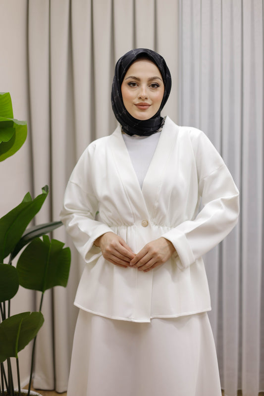Bel Büzgülü Önü Düğme Detaylı Tesettür Takım - Beyaz