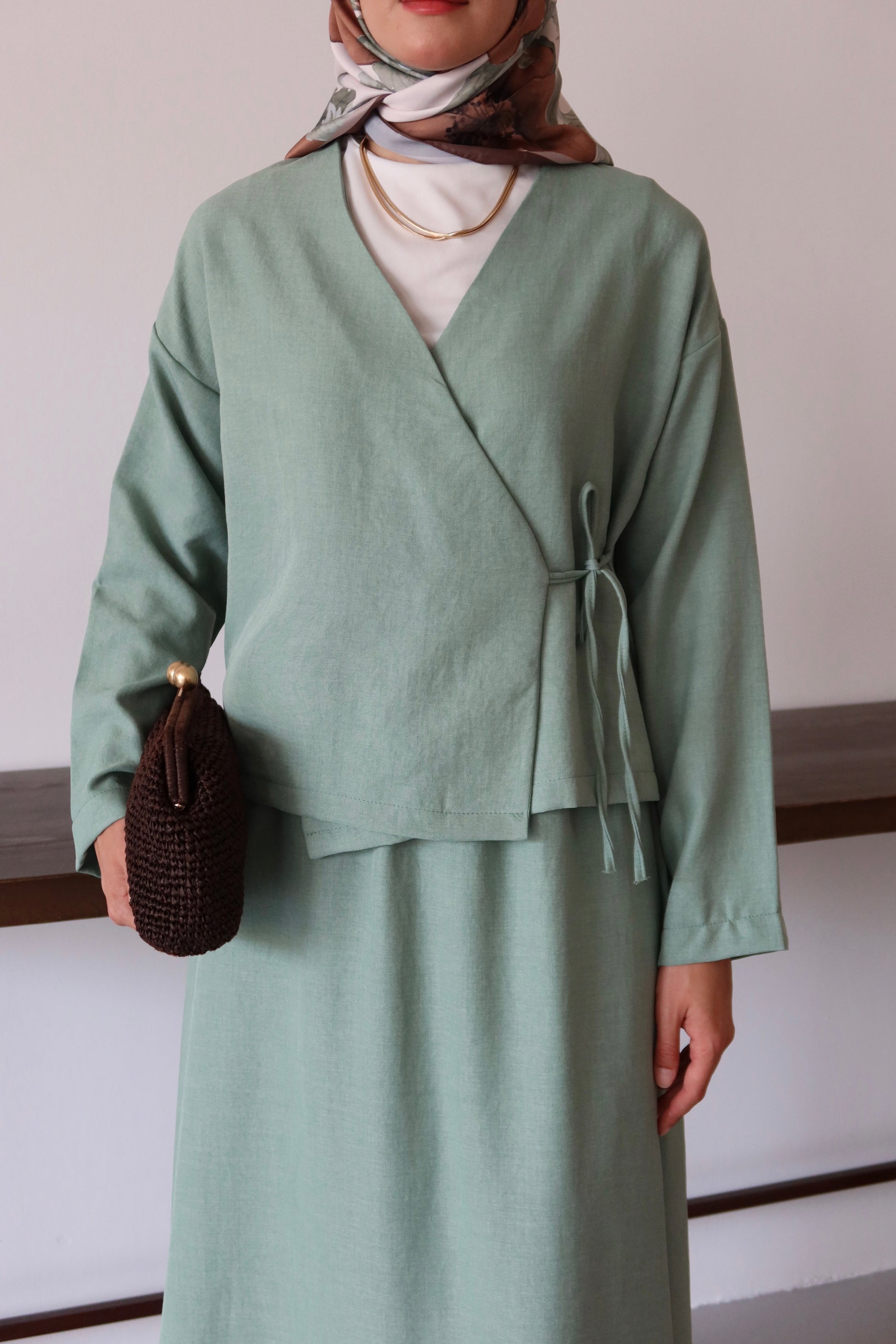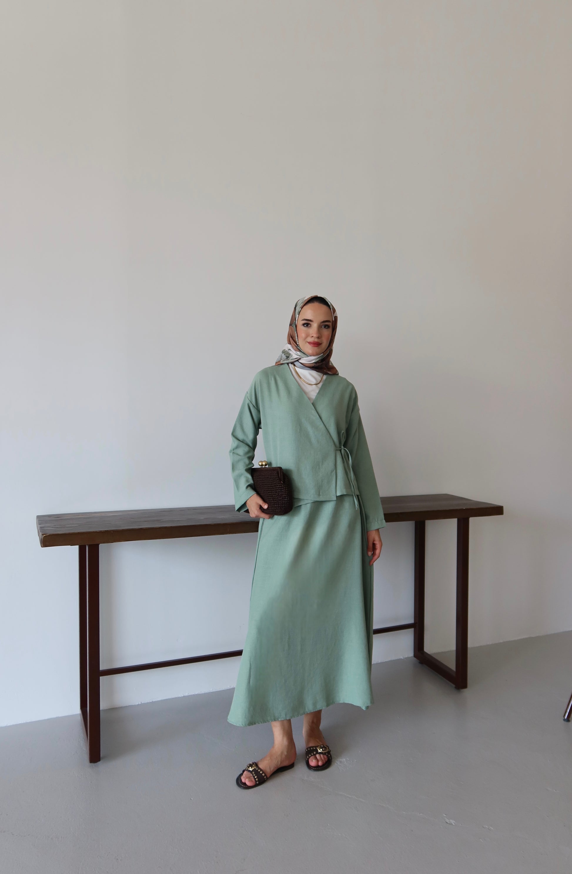 Yaz ayları için ideal olan bu takım, hafif keten materyali sayesinde serin tutar. V yaka kesimi feminen bir görünüm kazandırırken tesettür giyim koleksiyonuna modern bir dokunuş ekler. Sade ve düz deseniyle her türlü kombinle uyum sağlayarak zamansız bir stil oluşturur.
