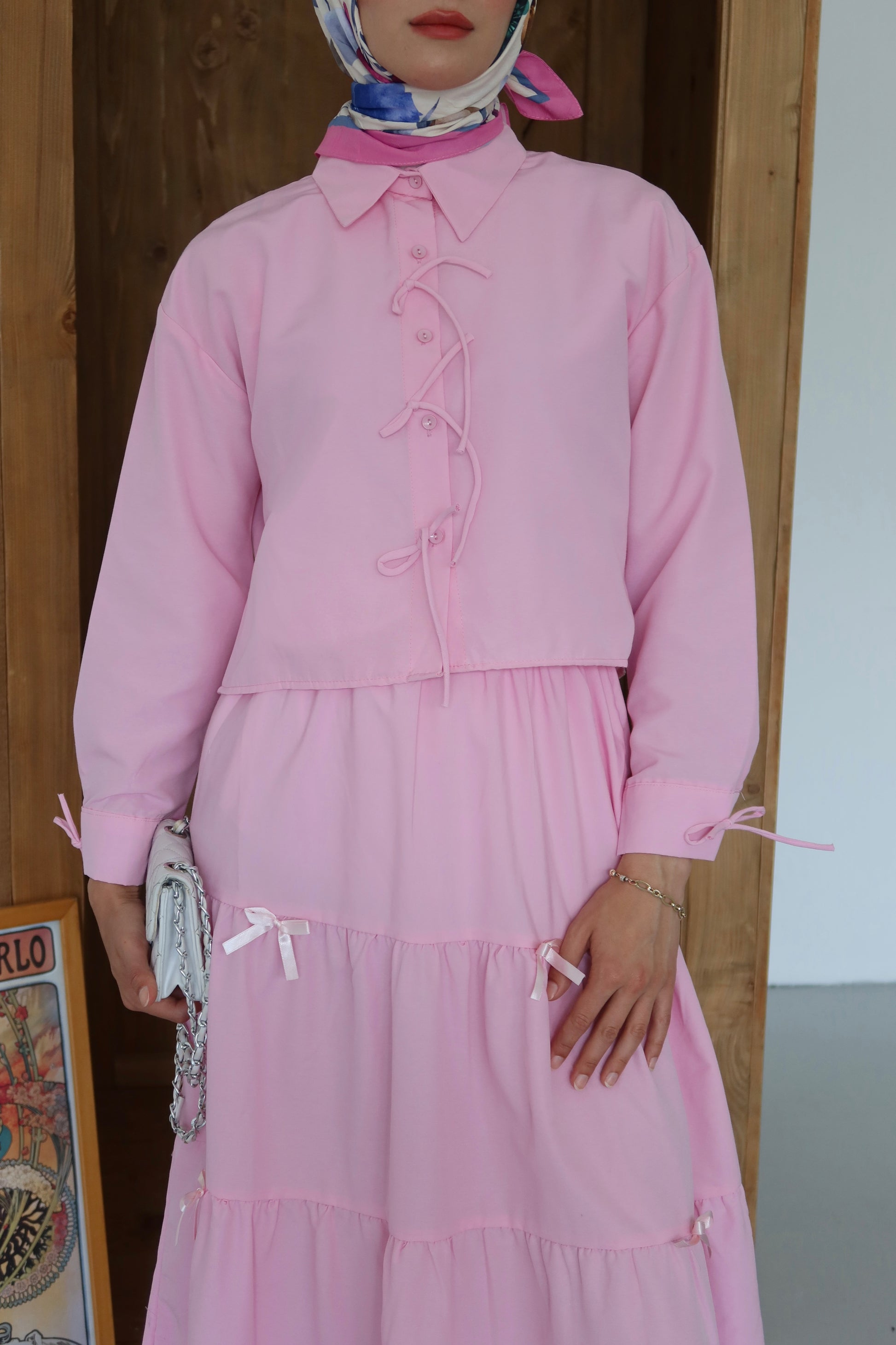 Kurdela İp Detay Etekli Tesettür Takım - Pembe