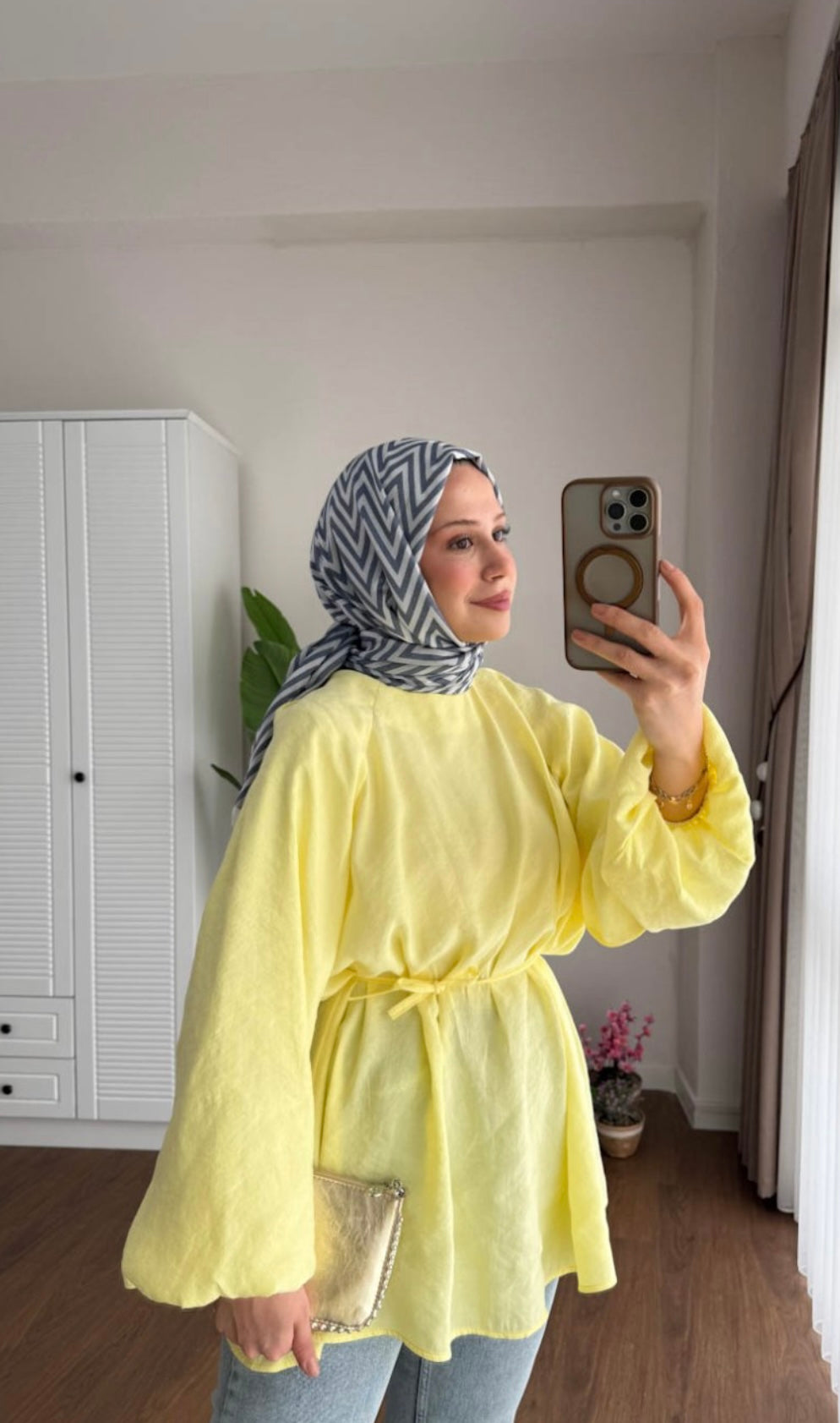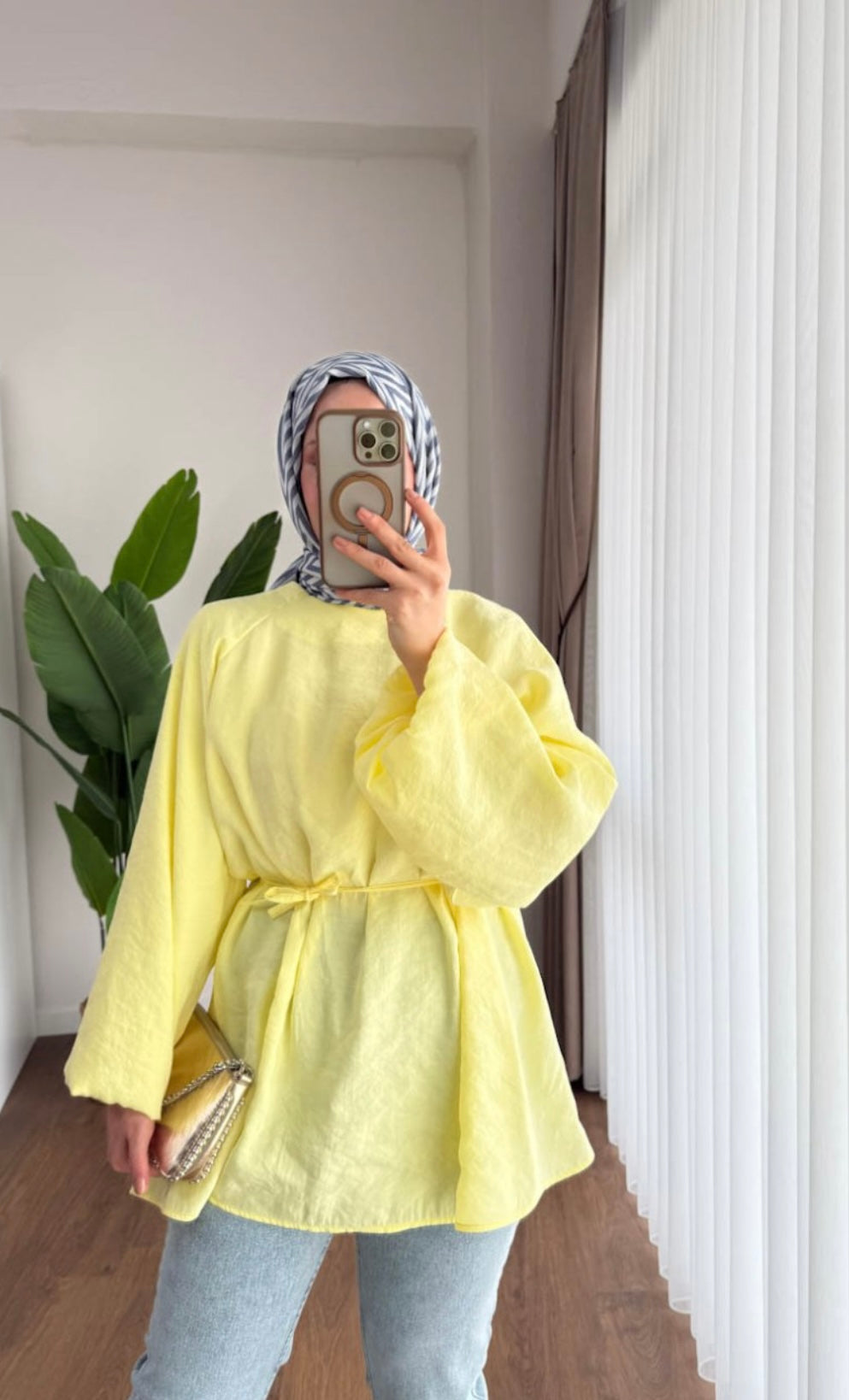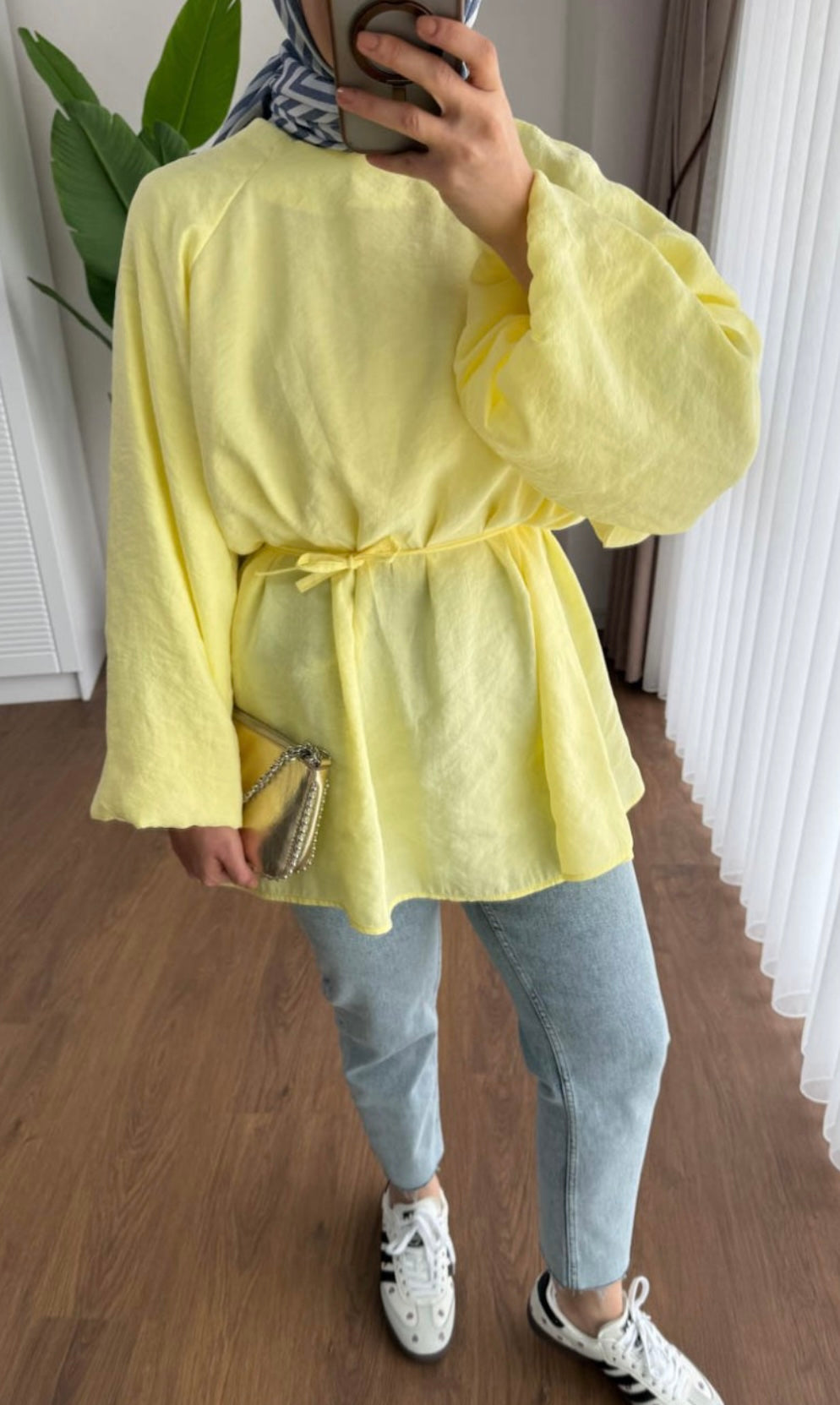 Balon Kol Bel Bağlamalı Tesettür Gömlek - Sarı