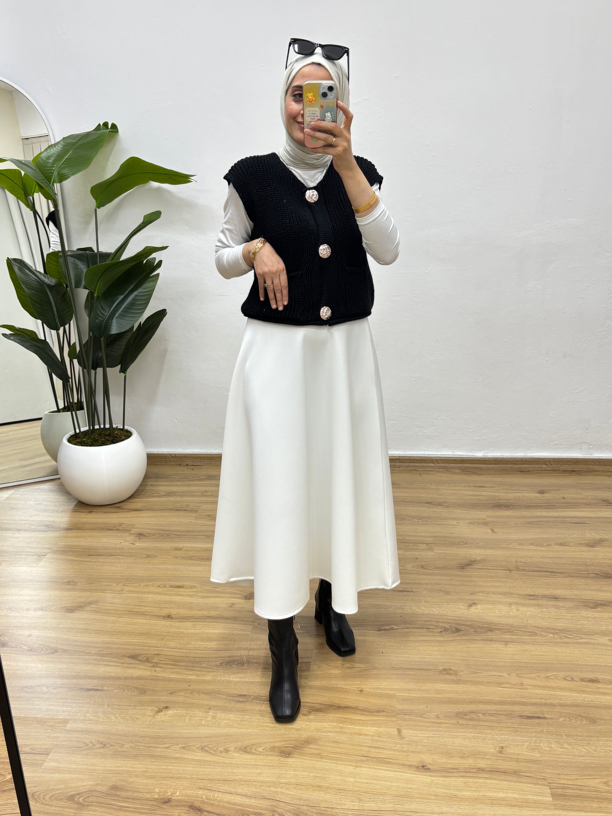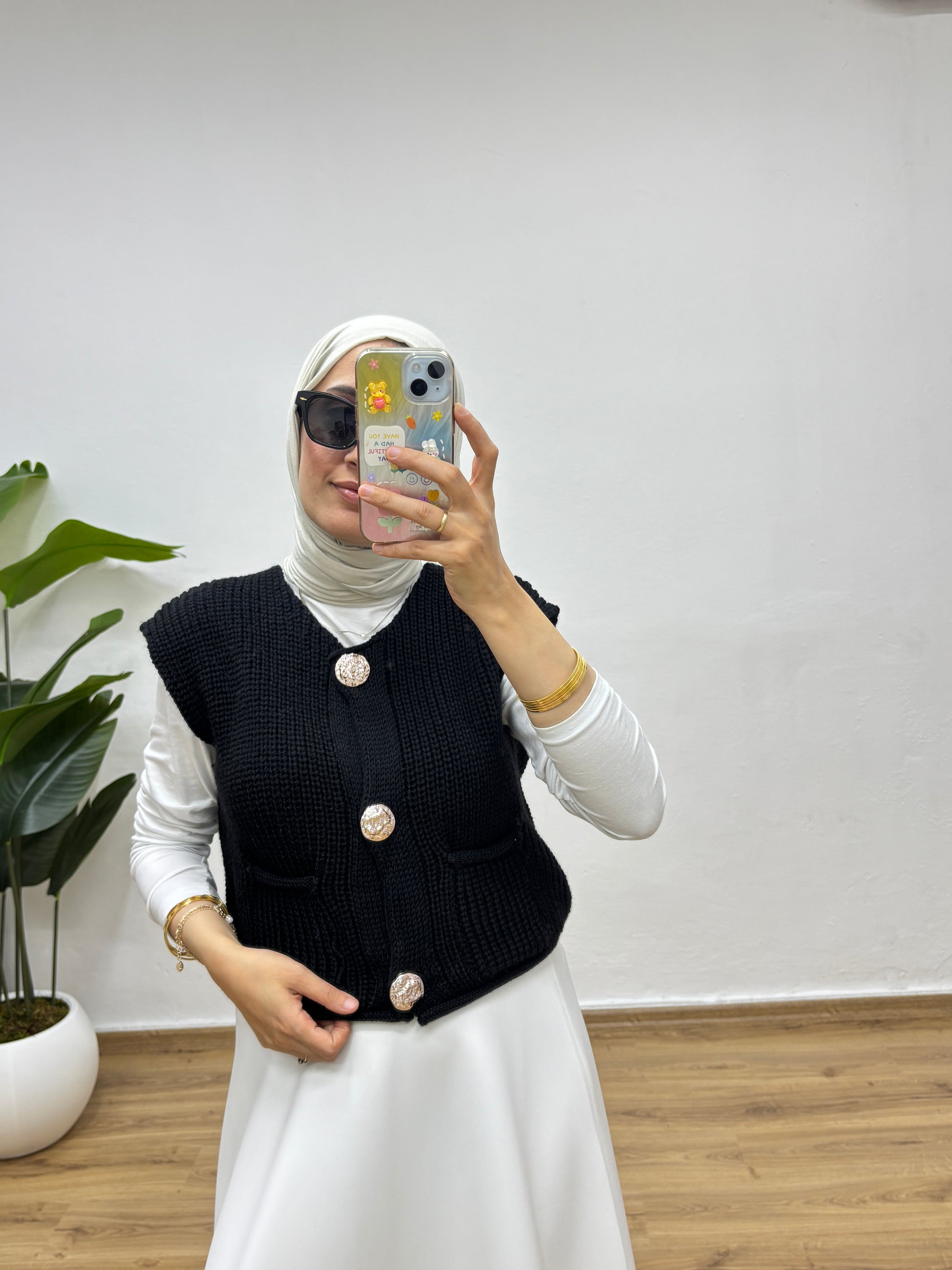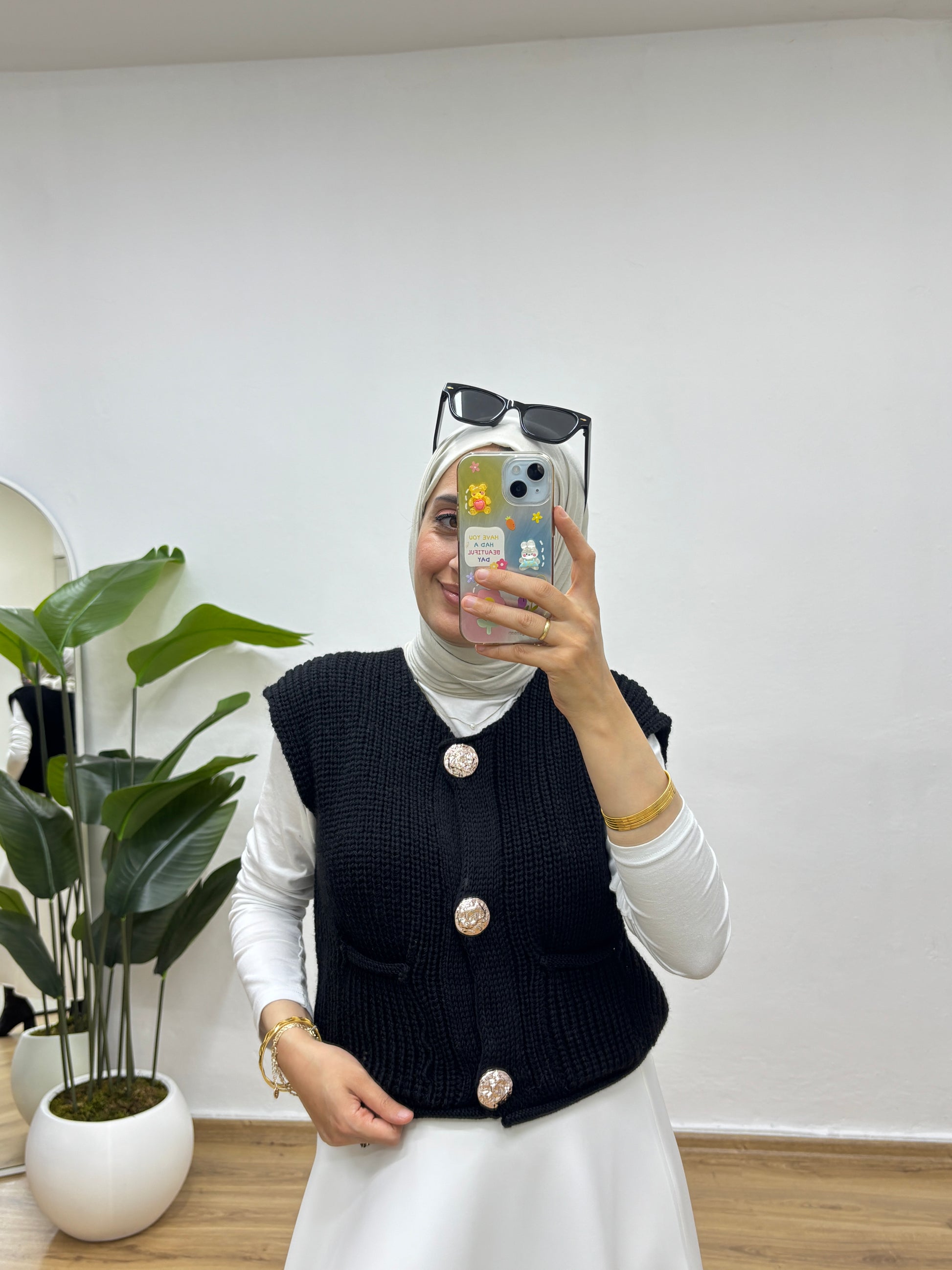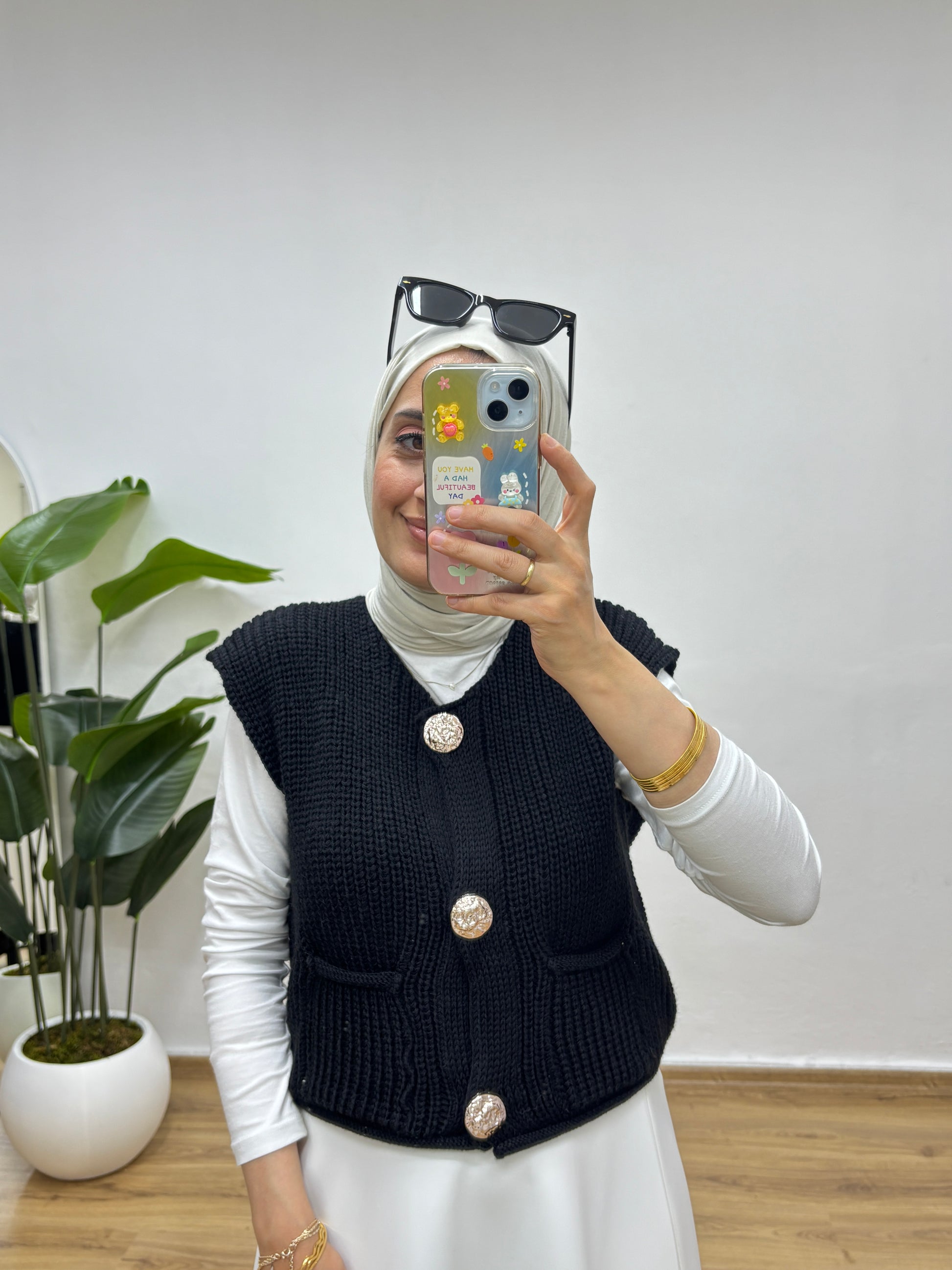 Gold Düğmeli Cepli Triko Yelek - Siyah