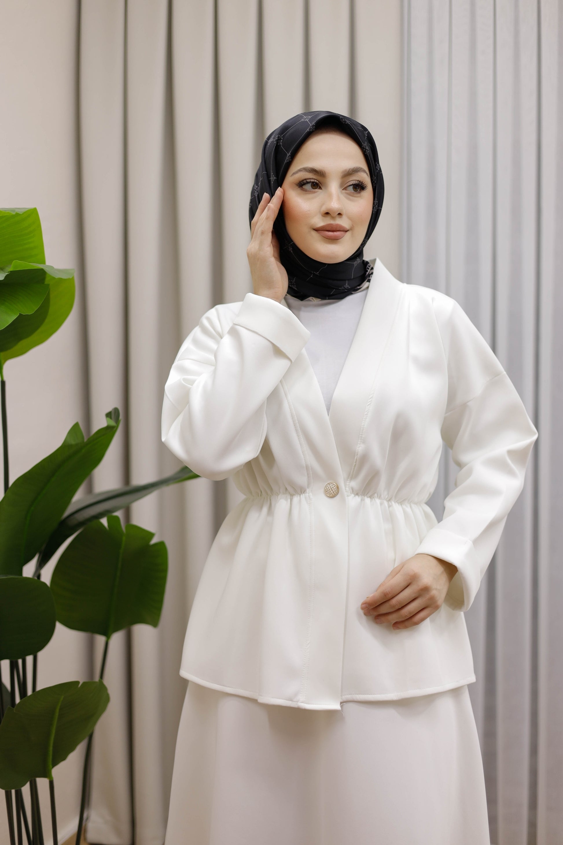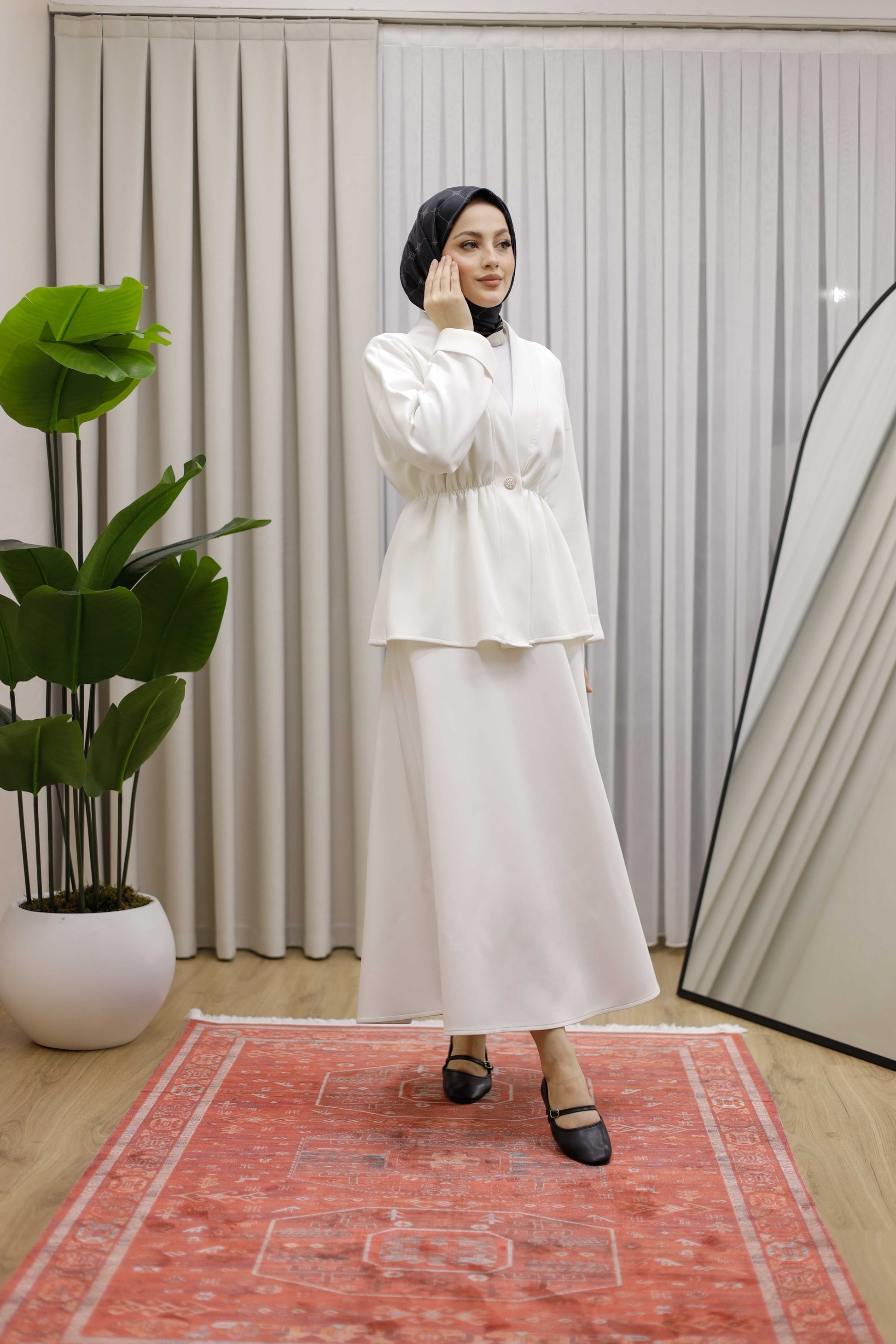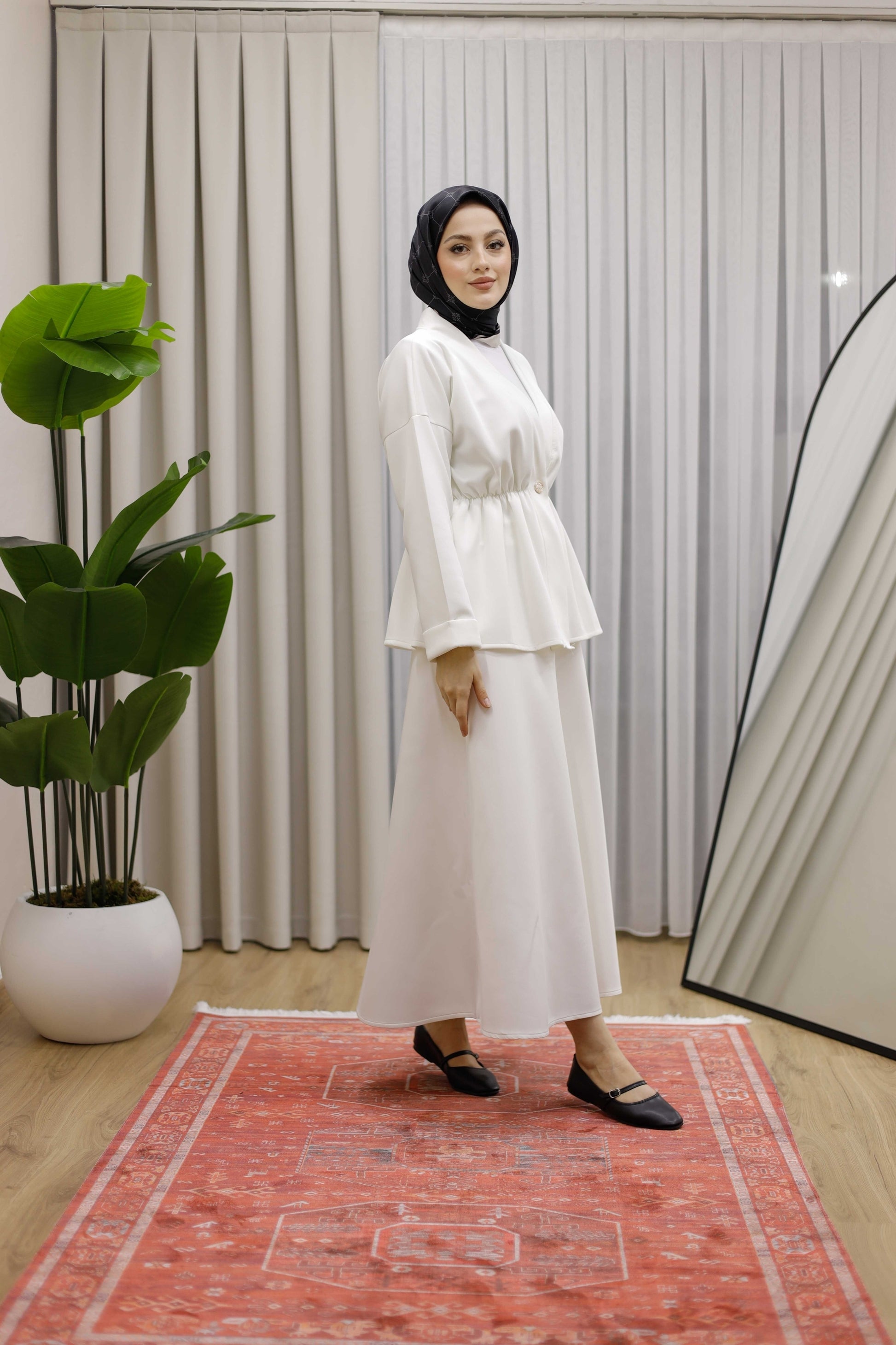 Bel Büzgülü Önü Düğme Detaylı Tesettür Takım - Beyaz