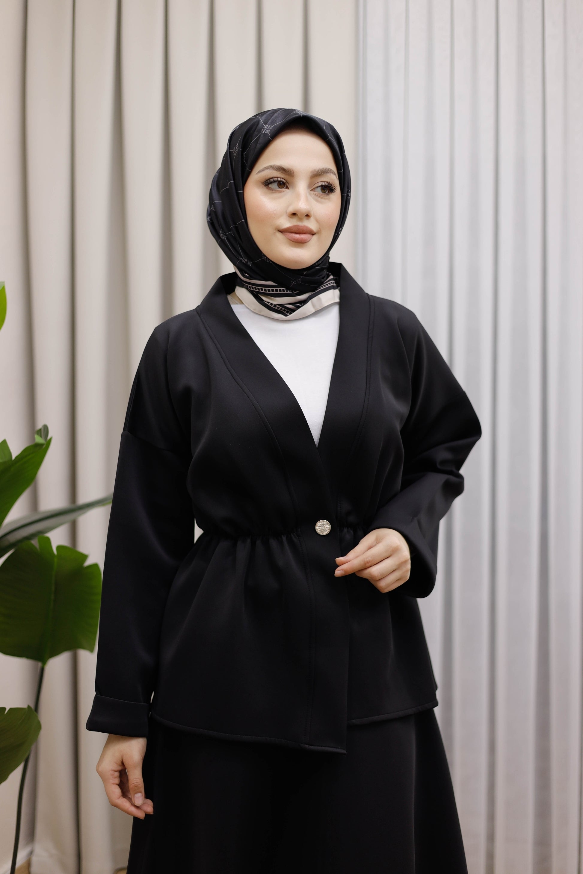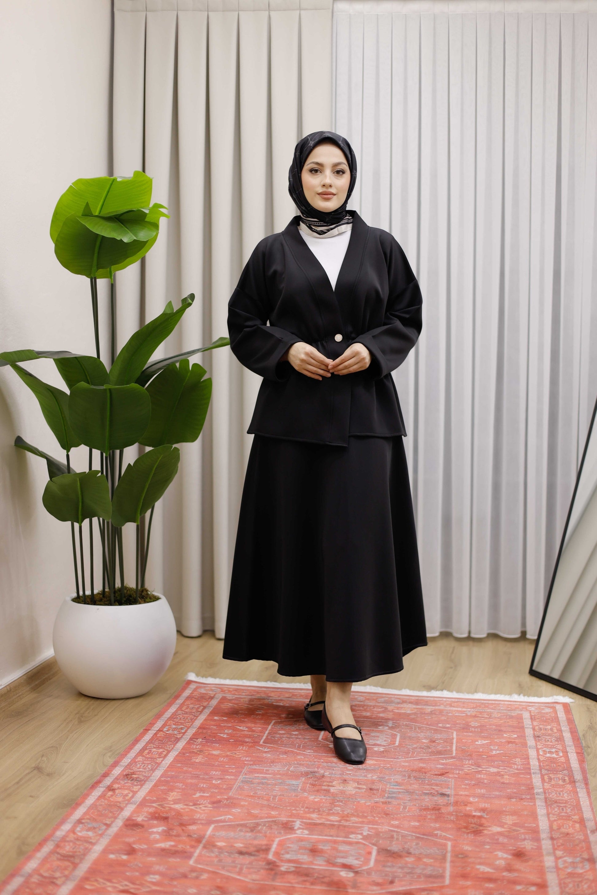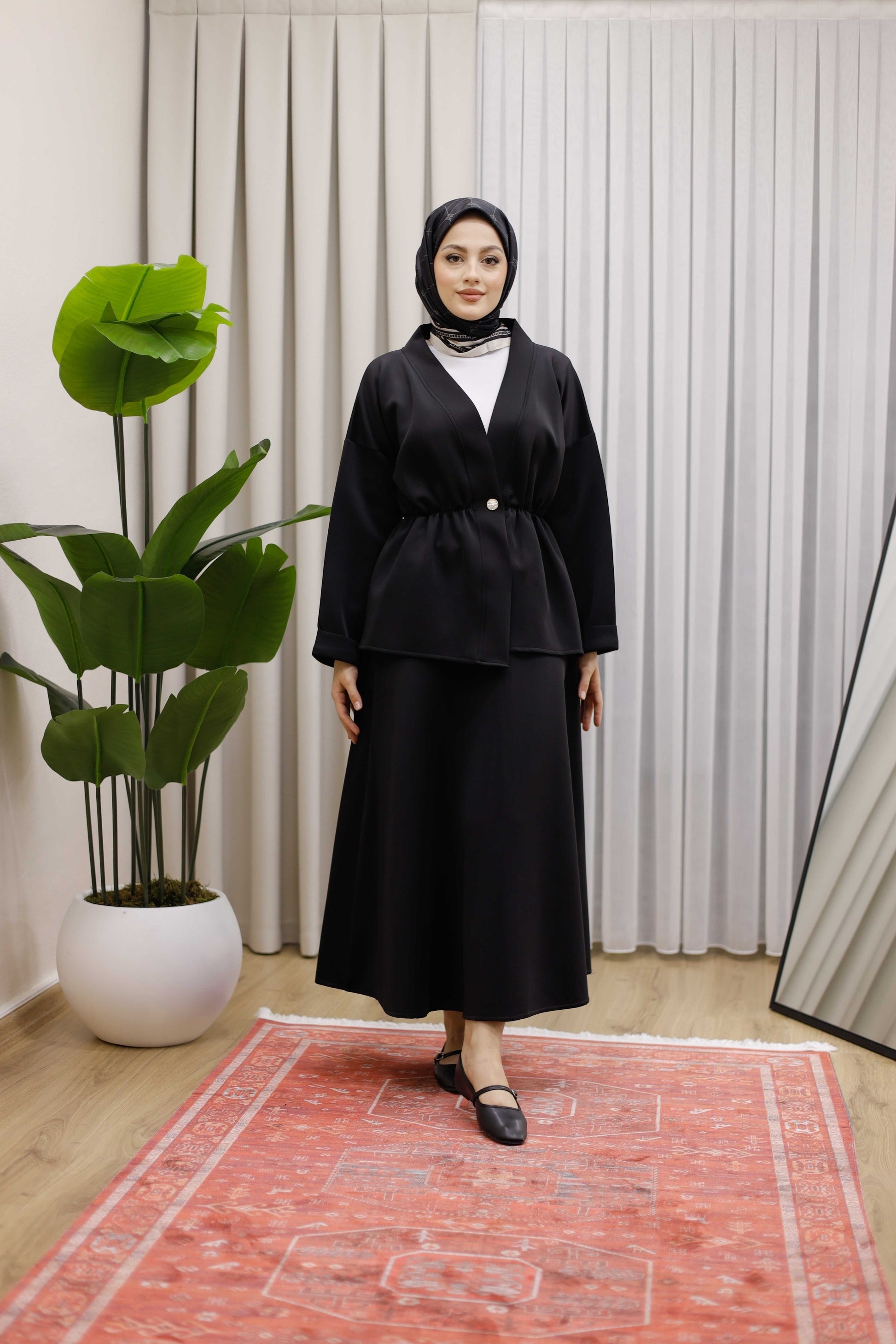 Bel Büzgülü Önü Düğme Detaylı Tesettür Takım - Siyah