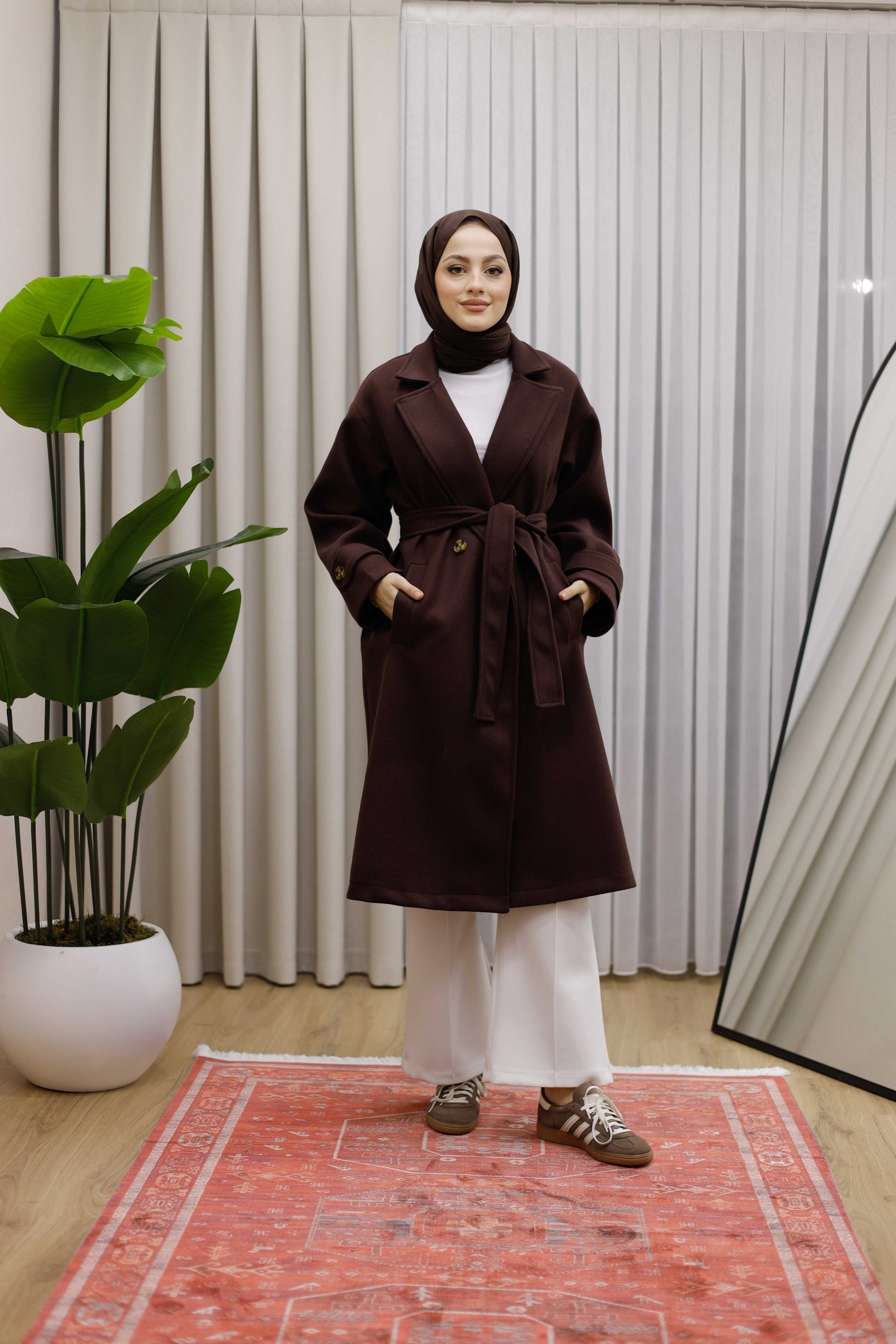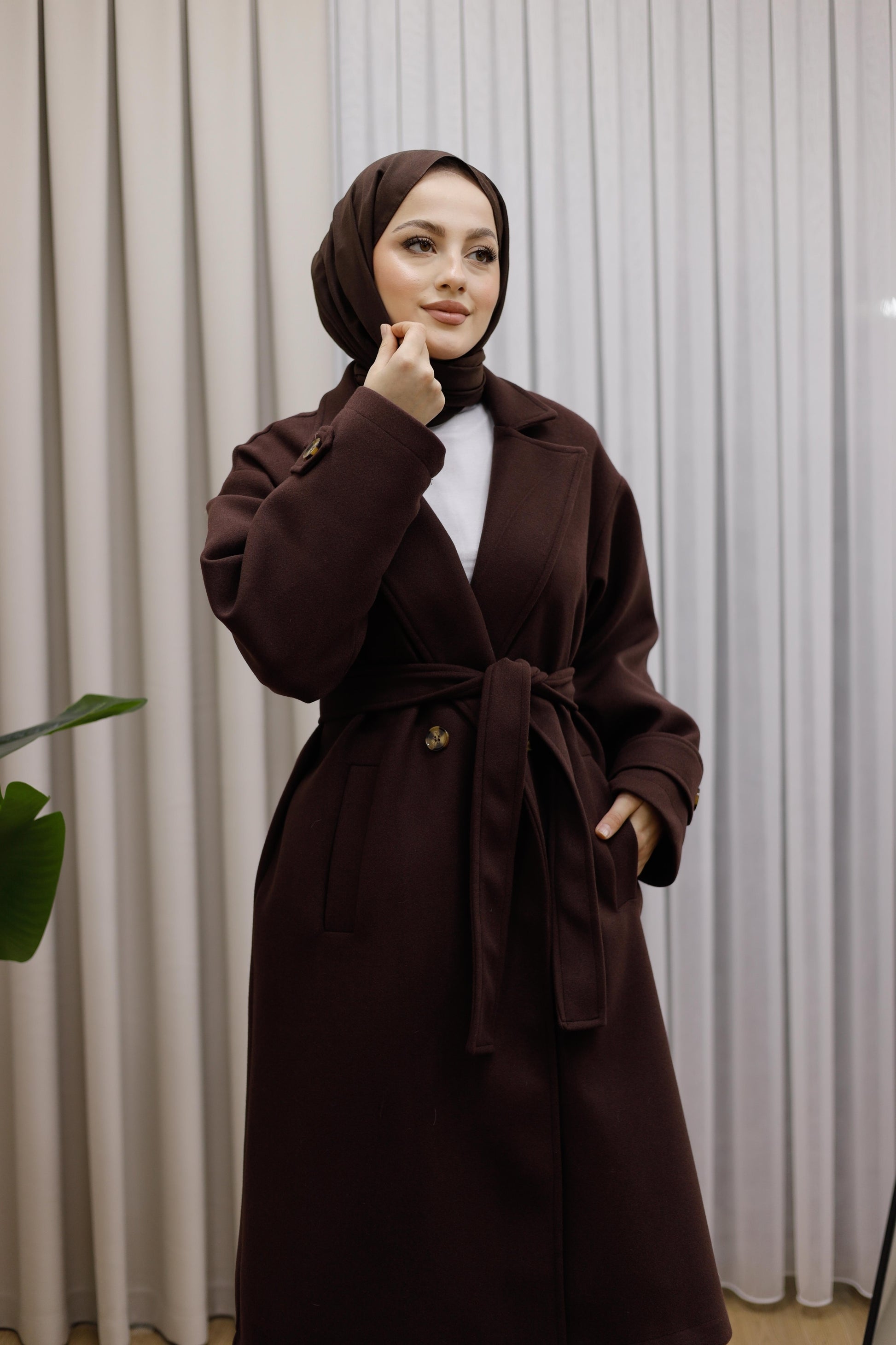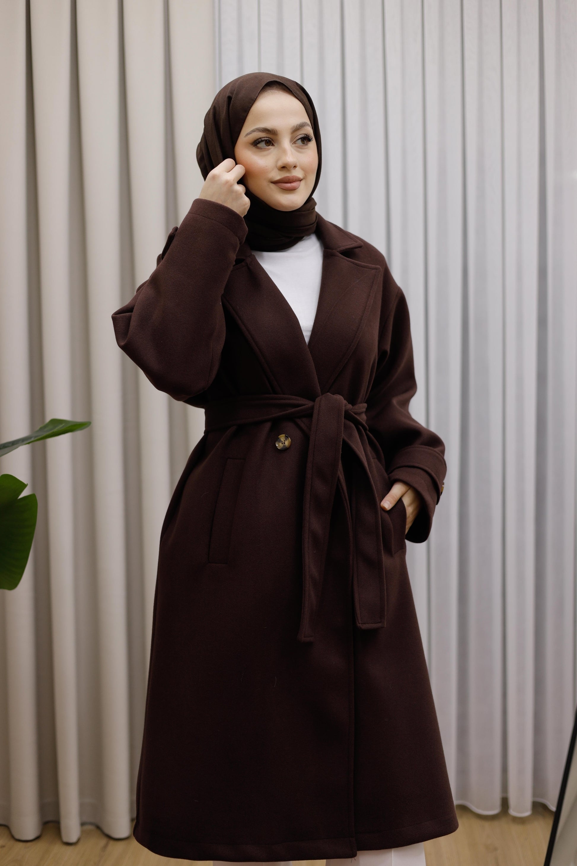 Ceket Yaka Kruvaze Kuşaklı Premium Ara Boy Kaban - Kahverengi