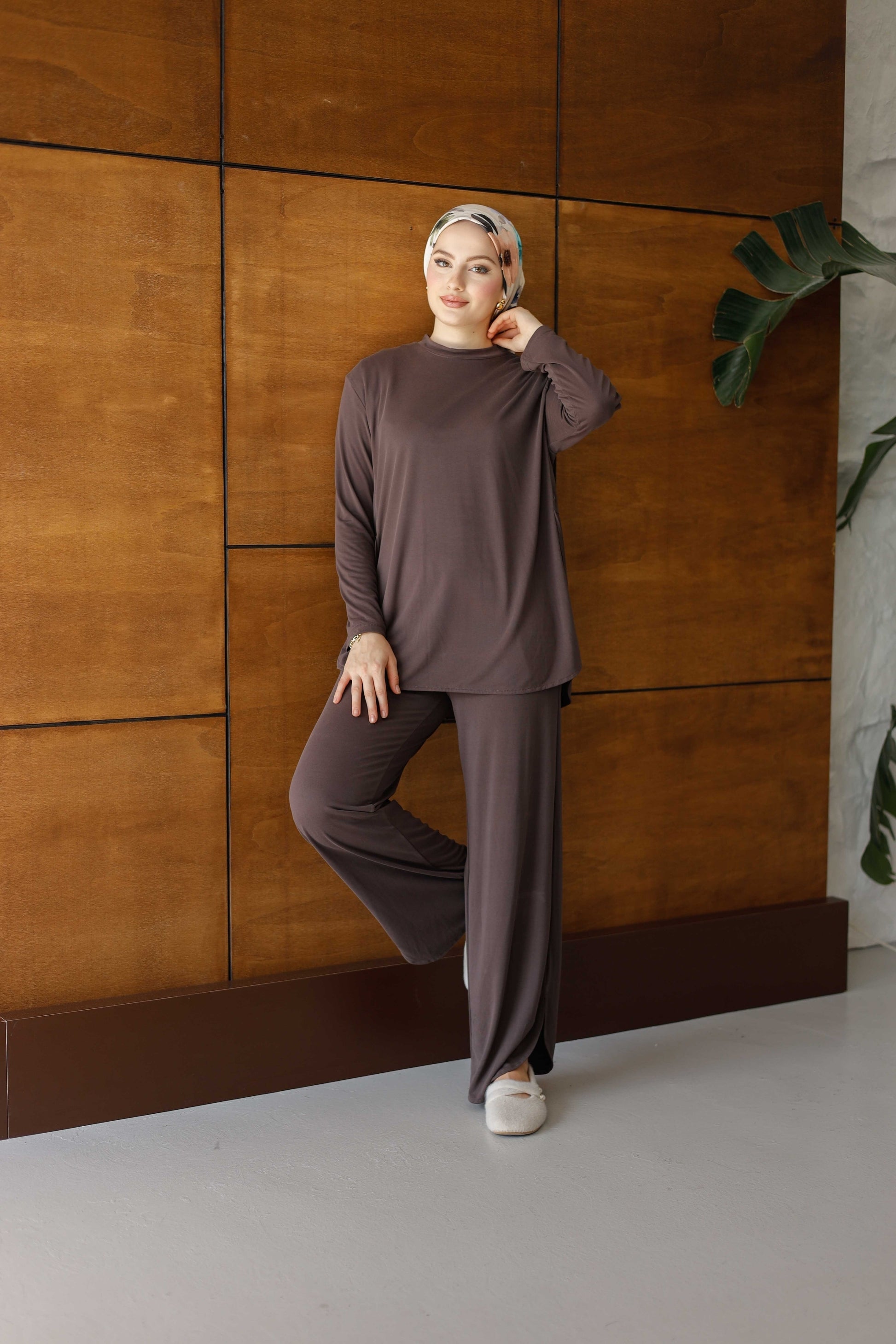 Esnek Ve Yumuşak Dokulu Oysh Tesettür Takım - Kahverengi
