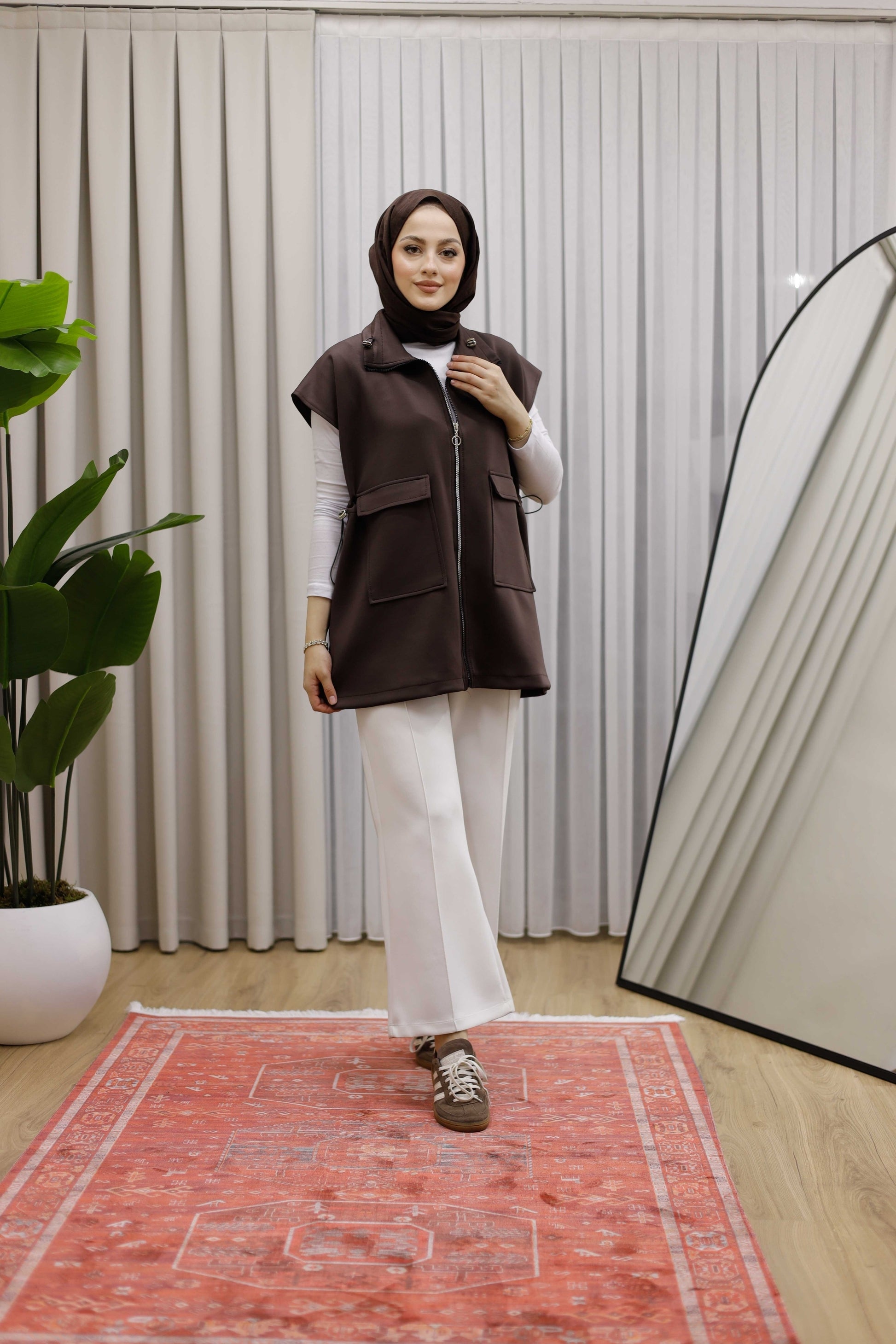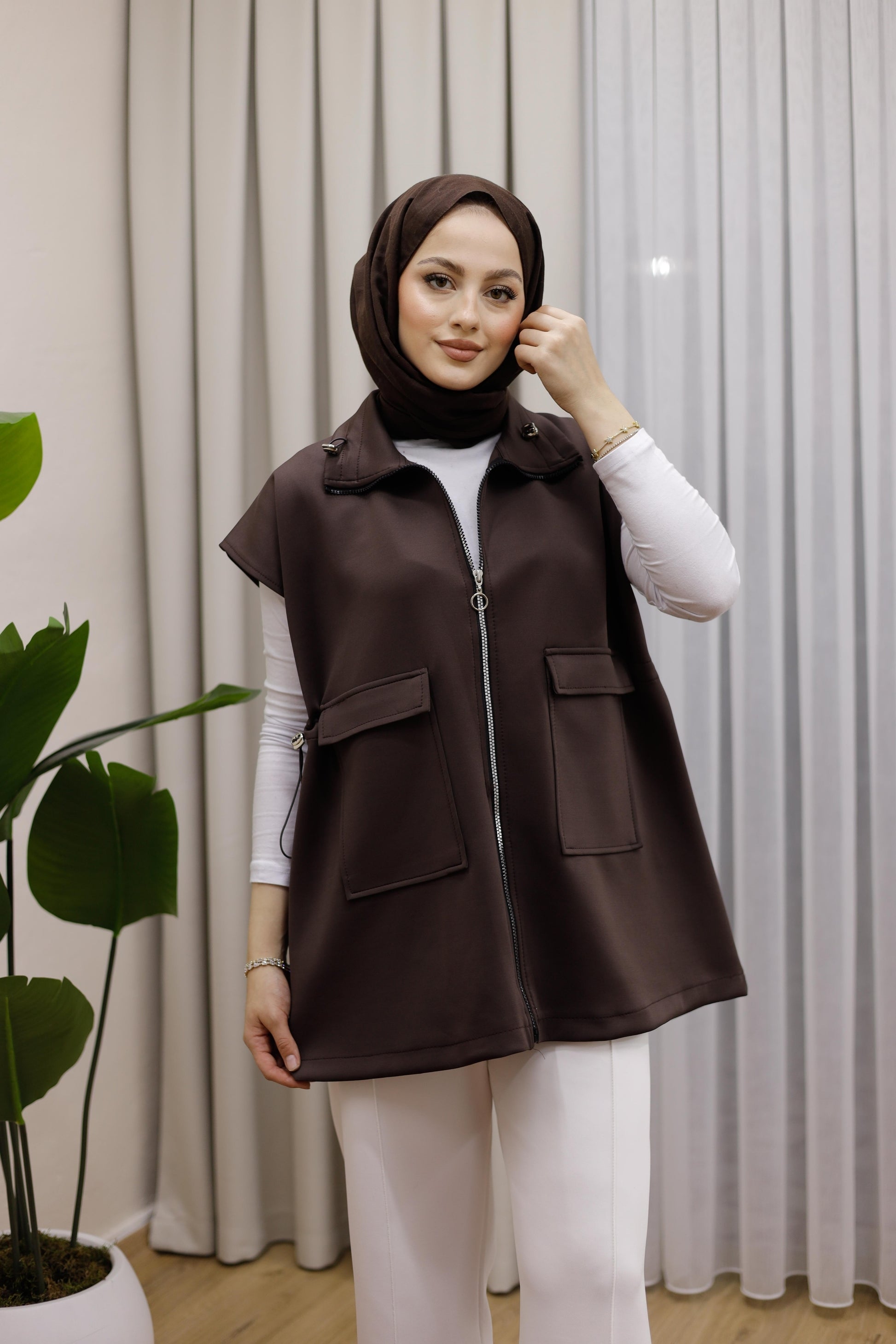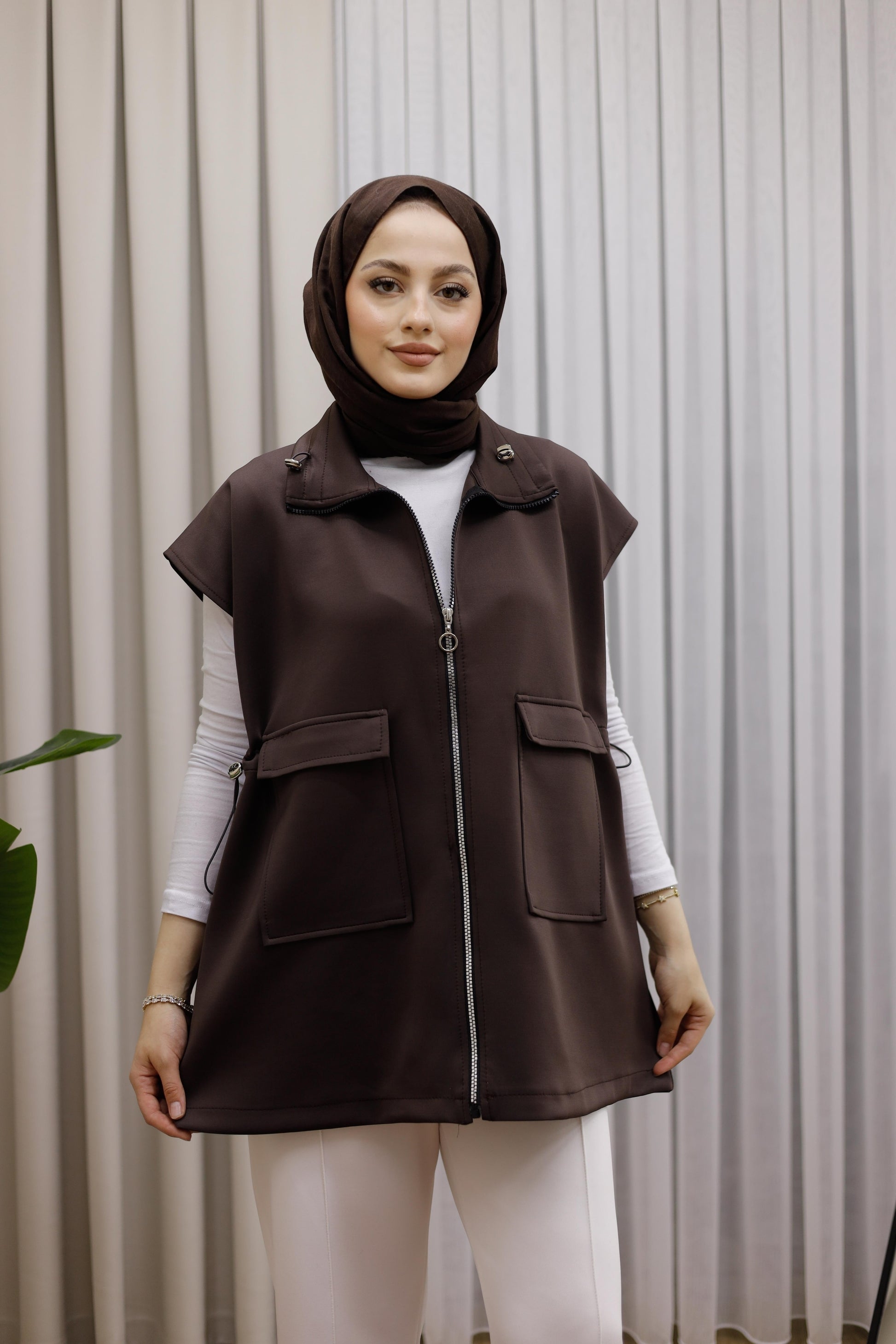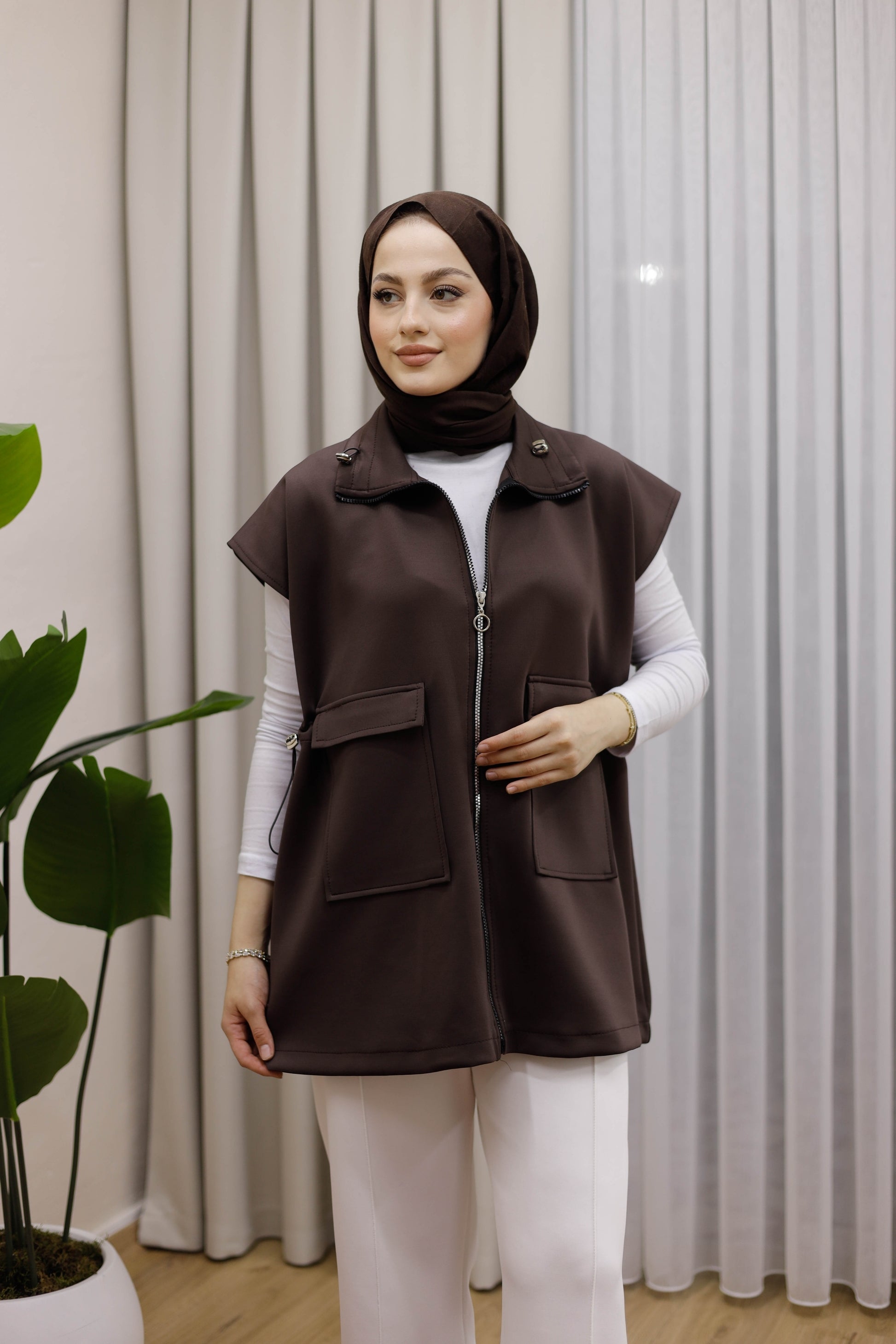 Fermuarlı Ve Çift Cepli Yelek - Kahverengi