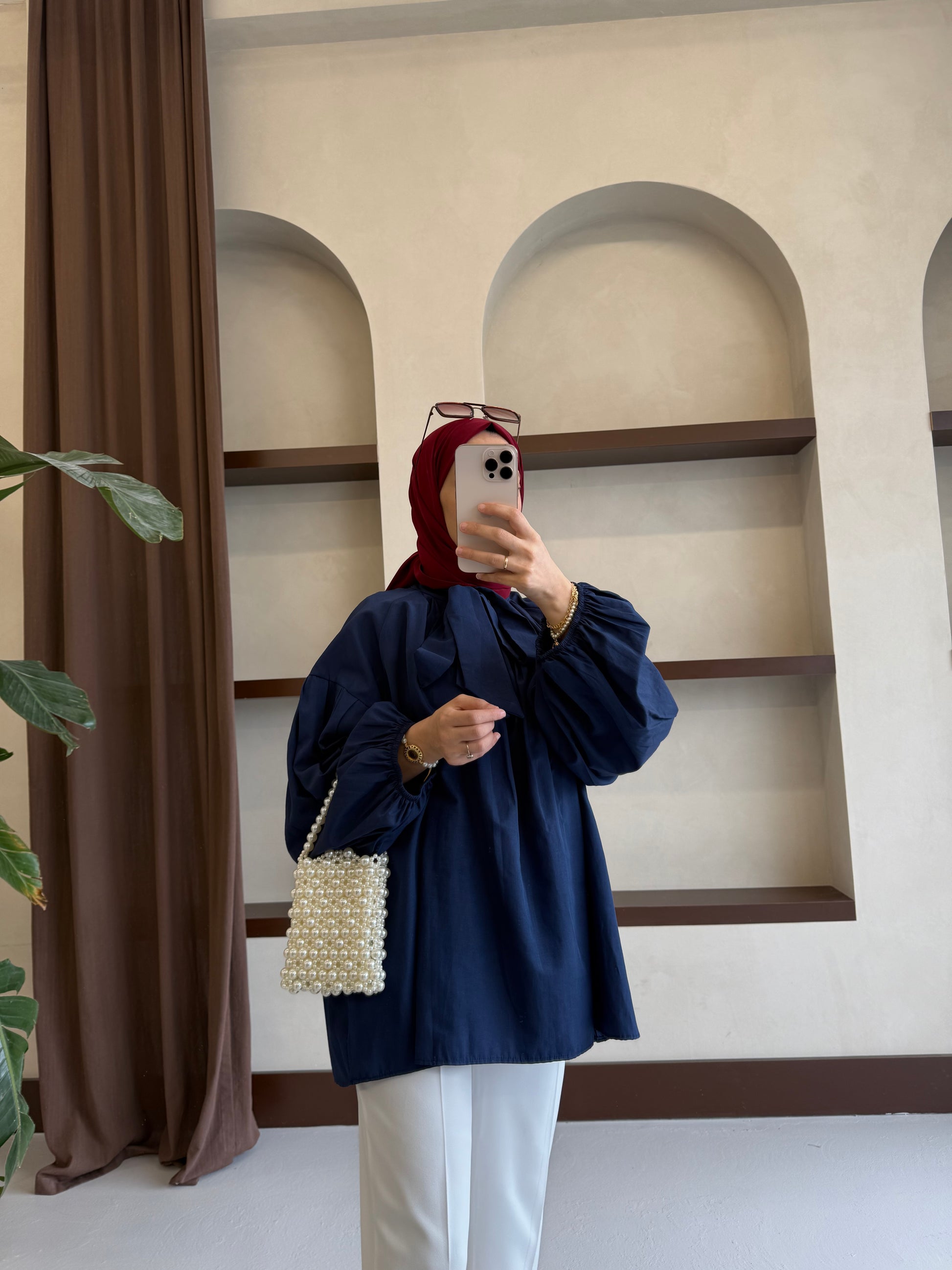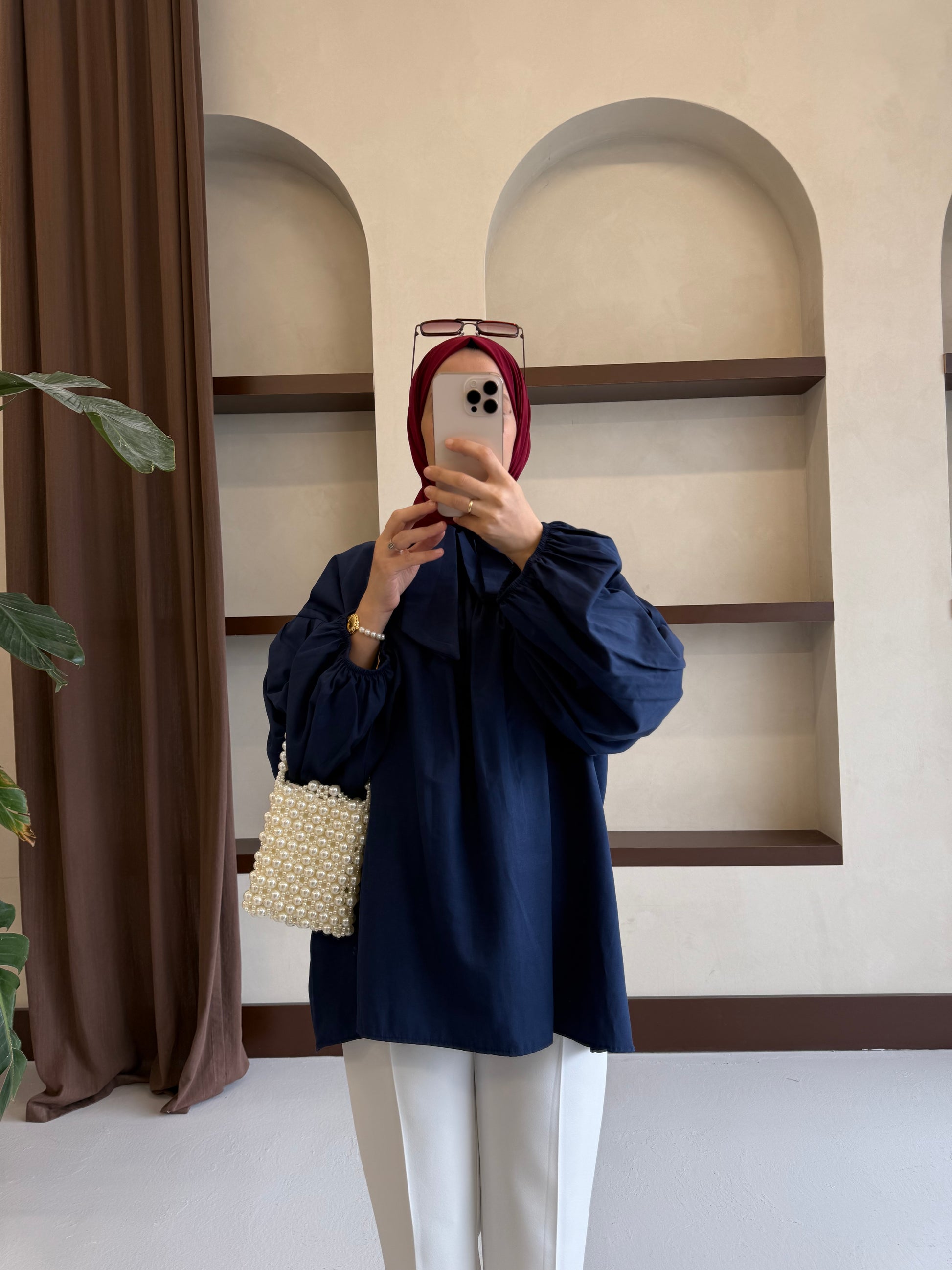 Yakası Bağlamalı Balon Kol Tesettür Gömlek - Lacivert