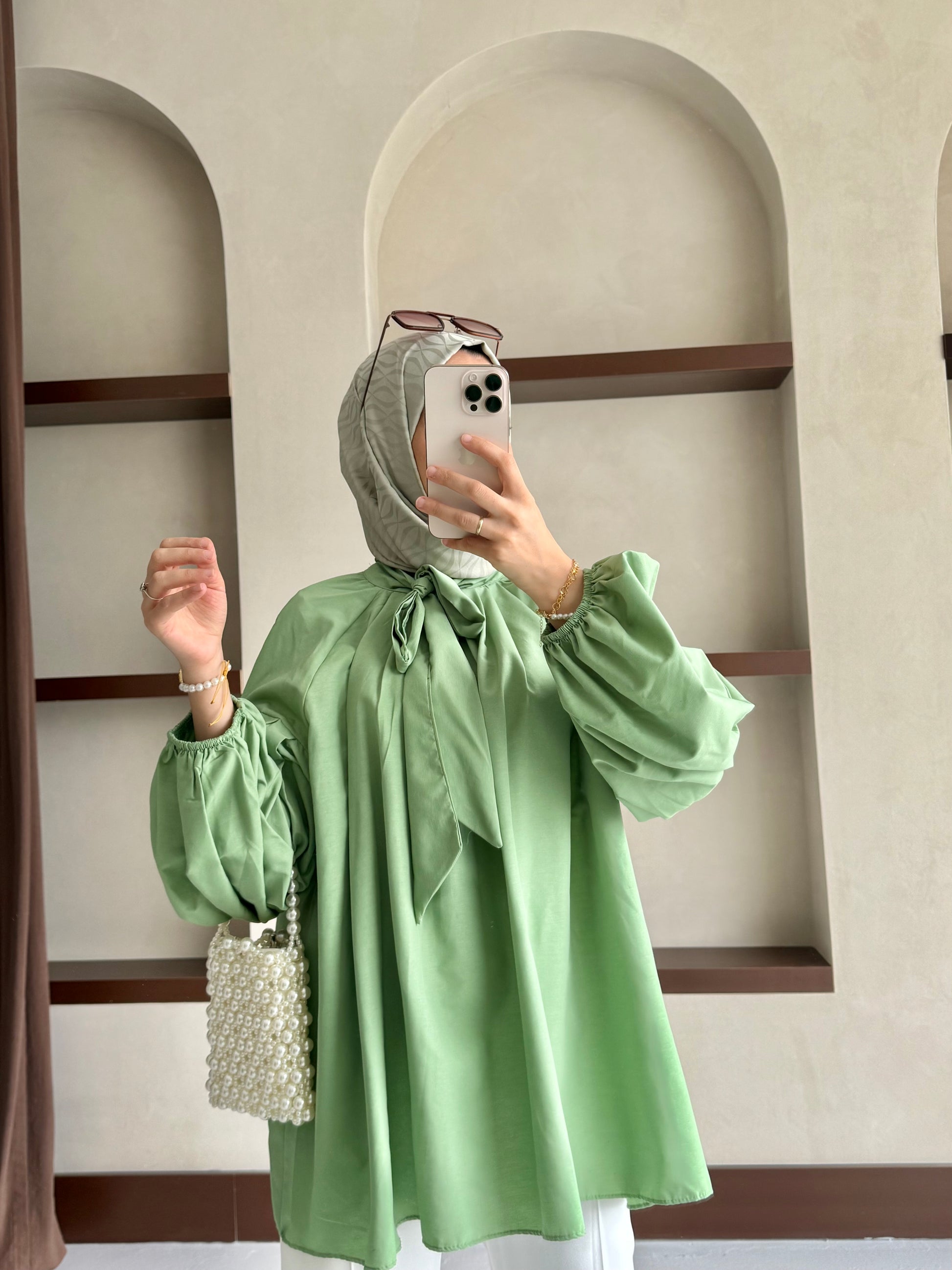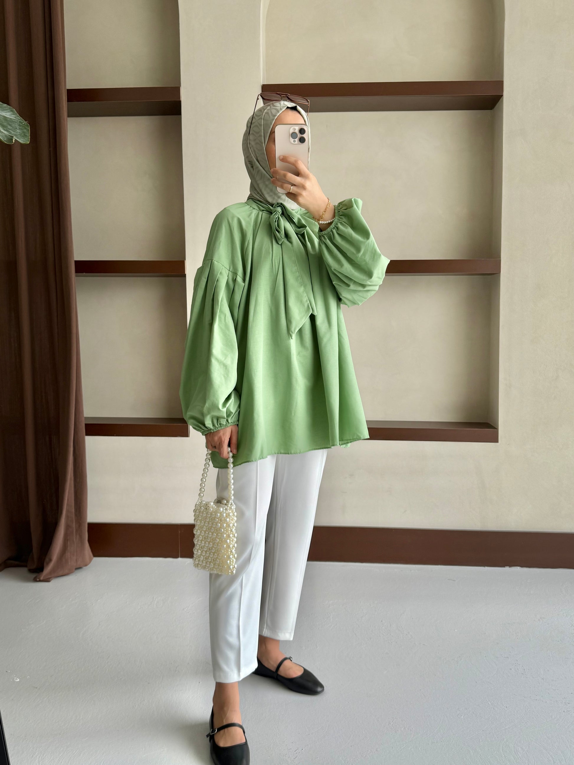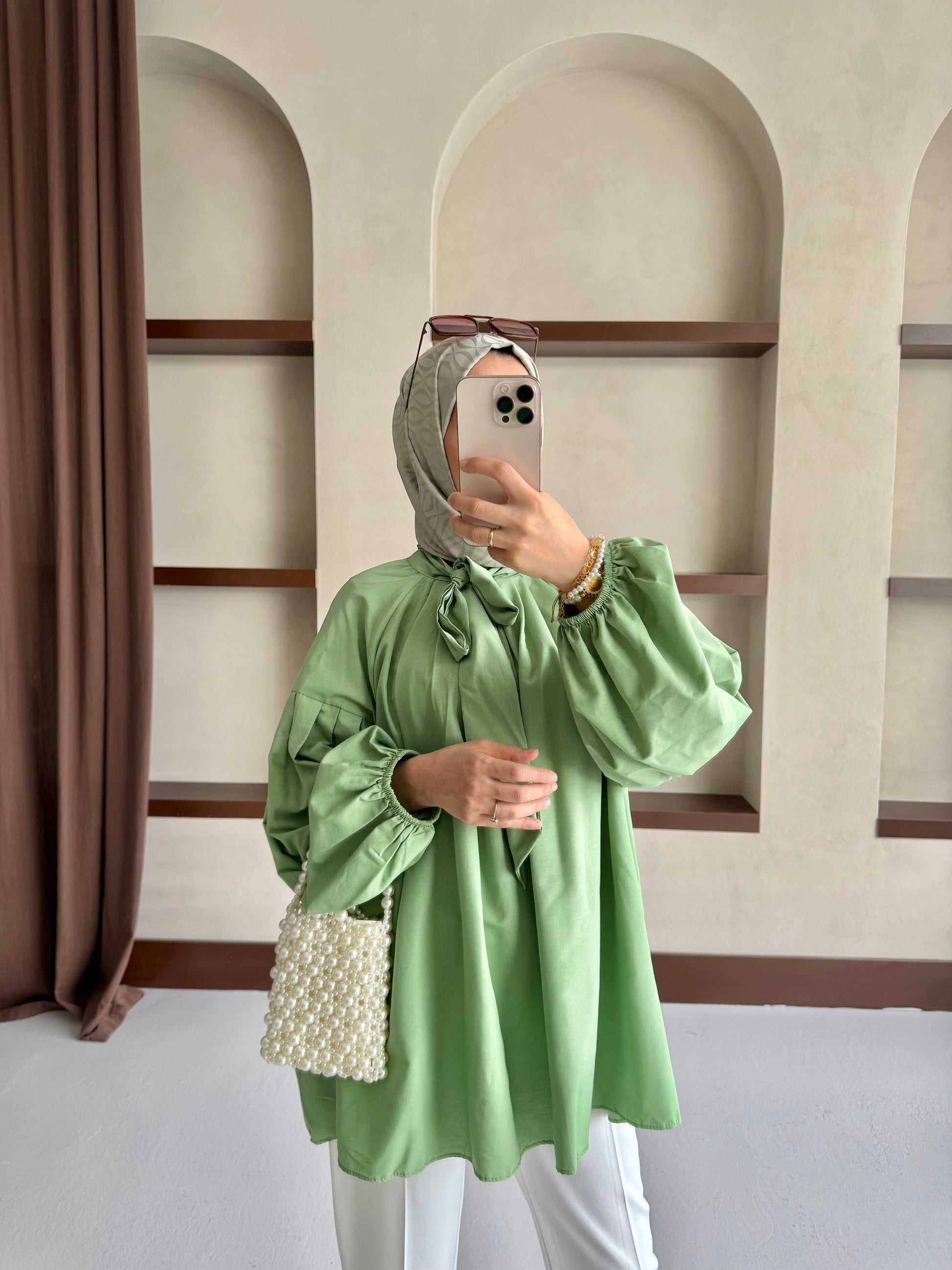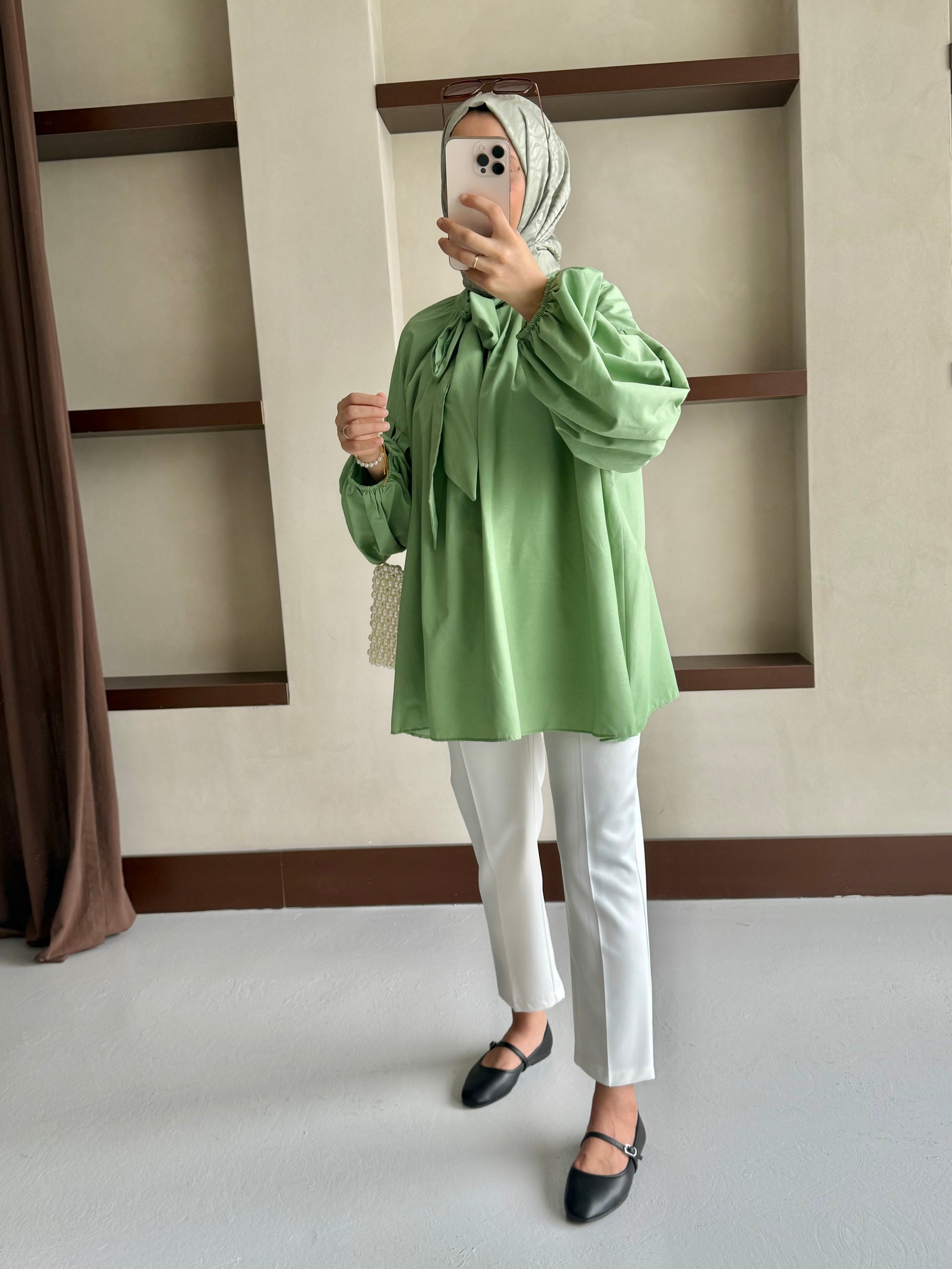 Yakası Bağlamalı Balon Kol Tesettür Gömlek - Yeşil